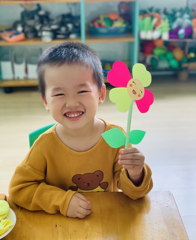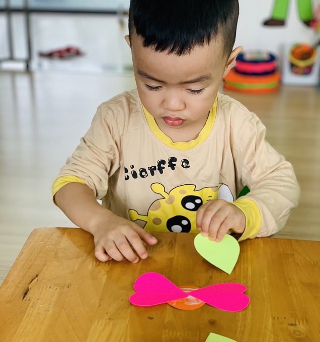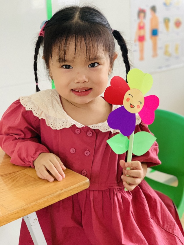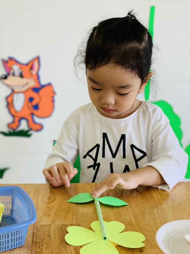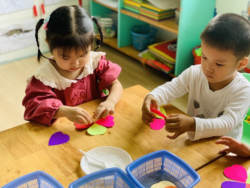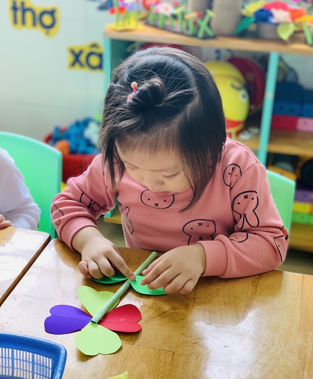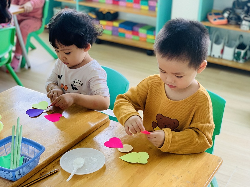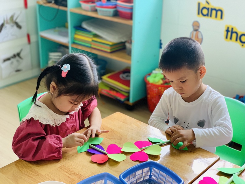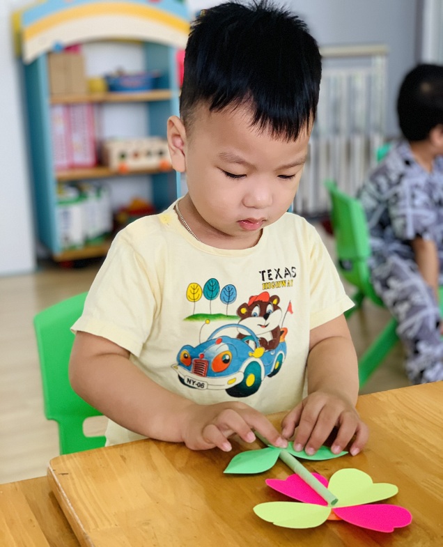 Dưới sự hướng dẫn của các cô giáo, các bé đã được tự tay dán những bông hoa rực rỡ sắc màu để dành tặng bà, tặng mẹ.