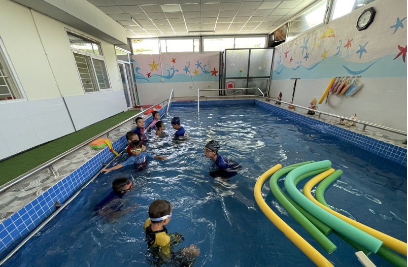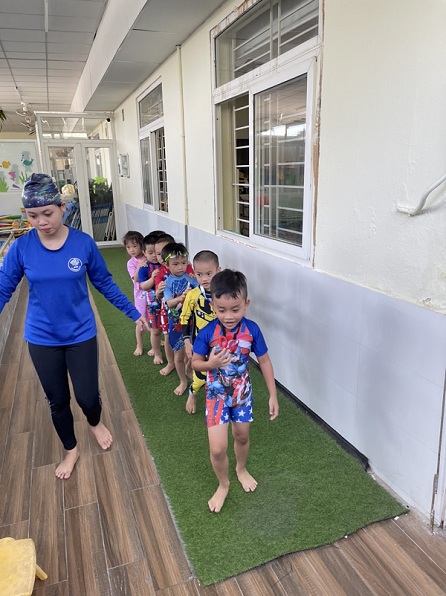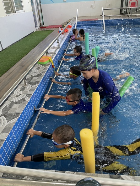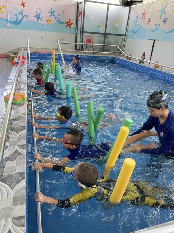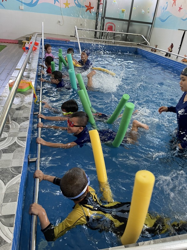 Hiểu được tầm quan trọng của kỹ năng bơi lội, tại trường Mầm non Ngôi Sao Xanh các bé đều được làm quen với nước và được tập bơi với sự hỗ trợ, huấn luyện của các giáo viên chuyên nghiệp. Đối với các bé, mỗi giờ bơi không chỉ là rèn luyện kỹ năng mà còn là những giây phút thoải mái và vui tươi.