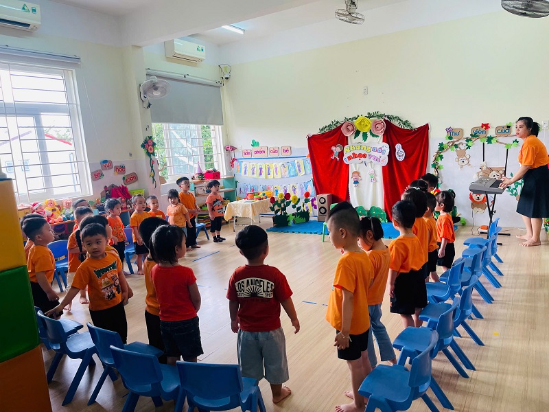 Các bé lớp Bé 2 được các cô dạy hát bài: "Cháu yêu cô chú công nhân"