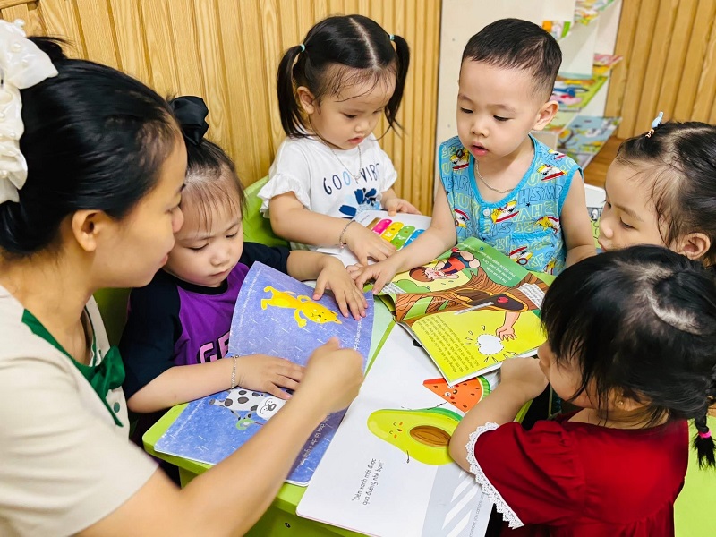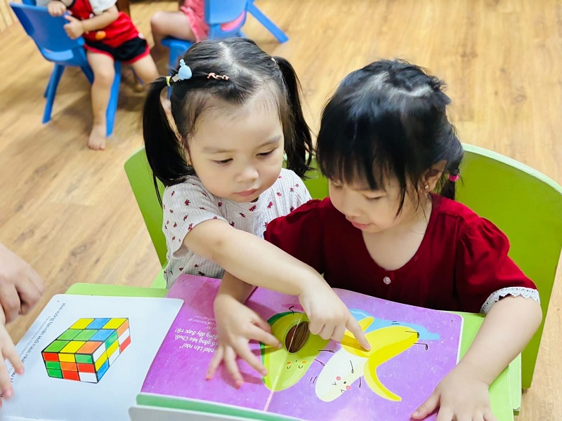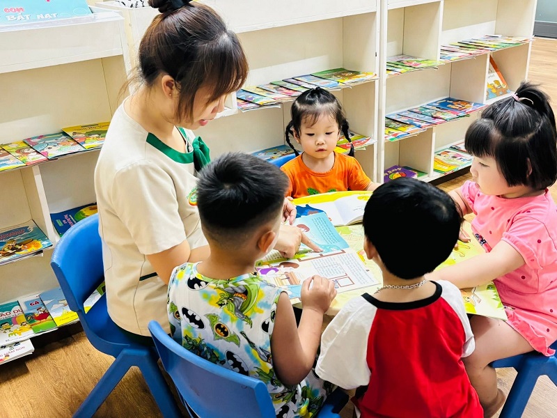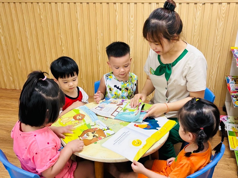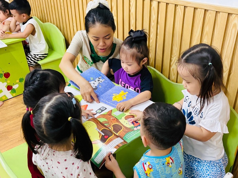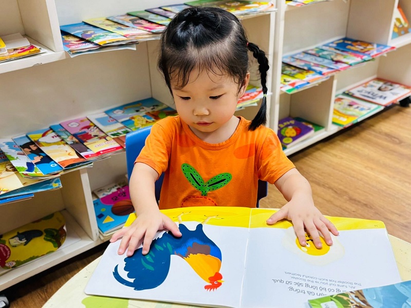 Các bạn nhỏ lớp MG Bé thích thú với hoạt động xem sách tại thư viện