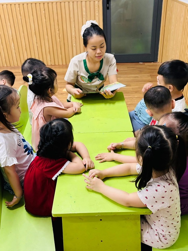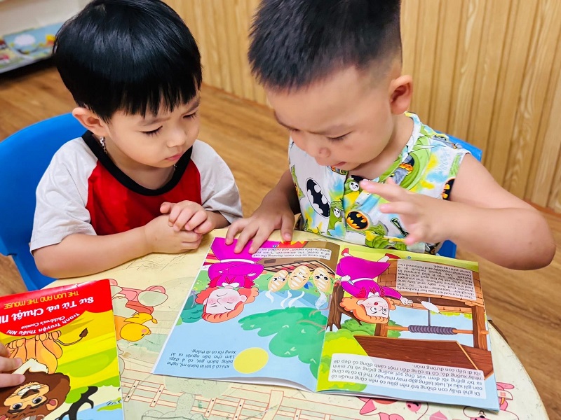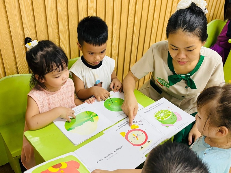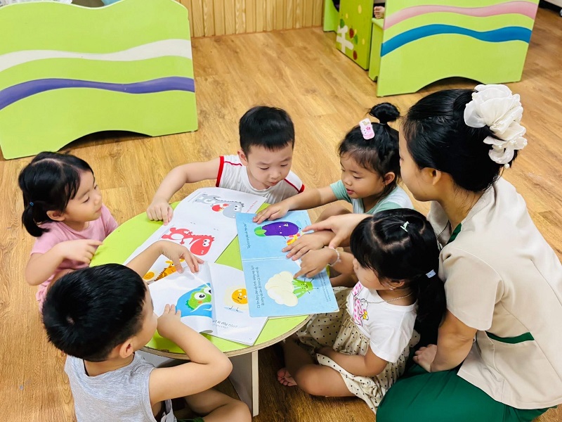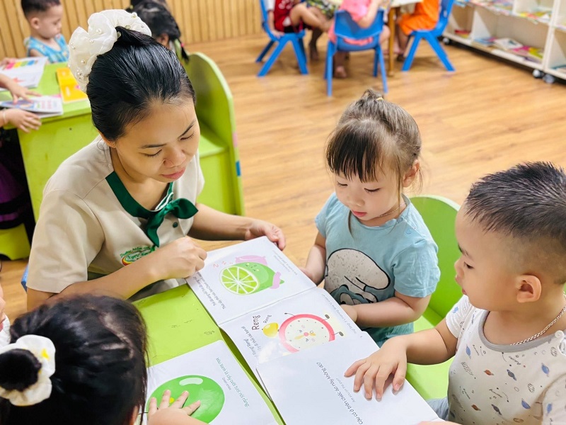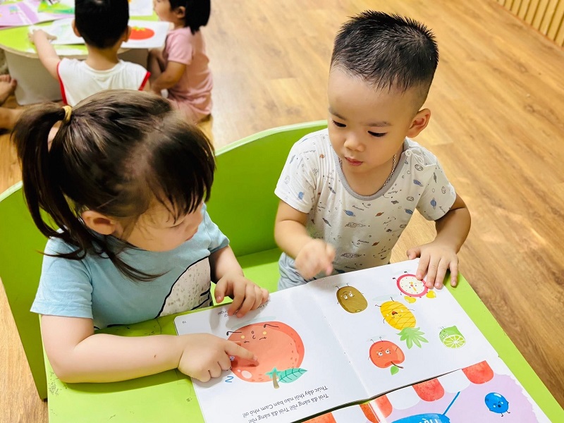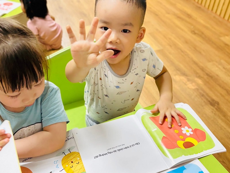 Các bạn nhỏ lớp MG Bé thích thú với hoạt động xem sách tại thư viện