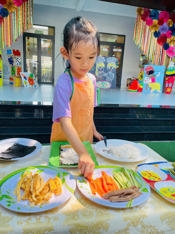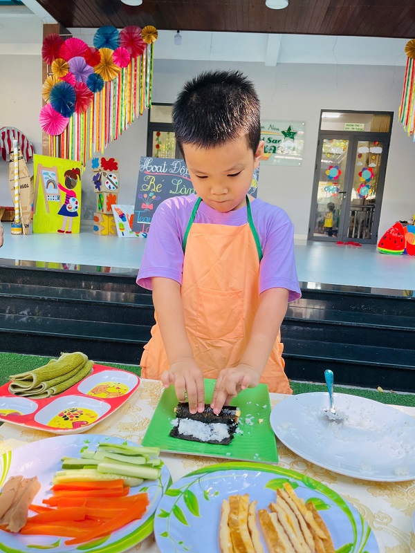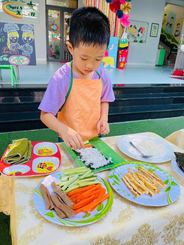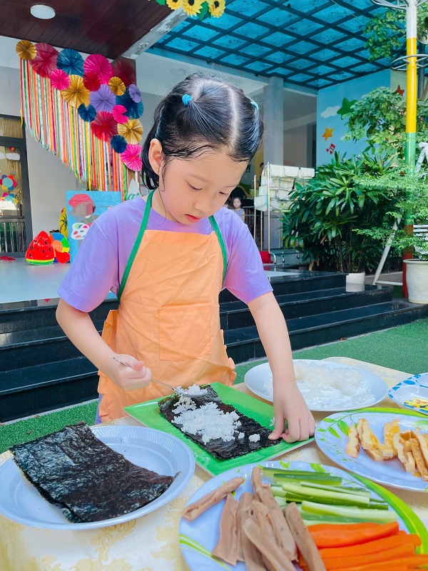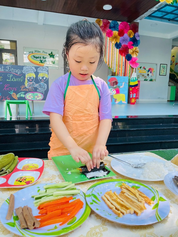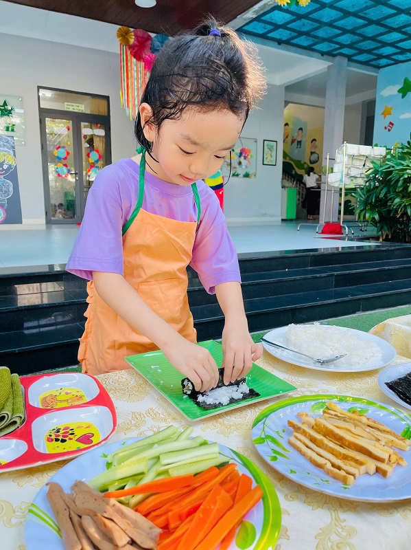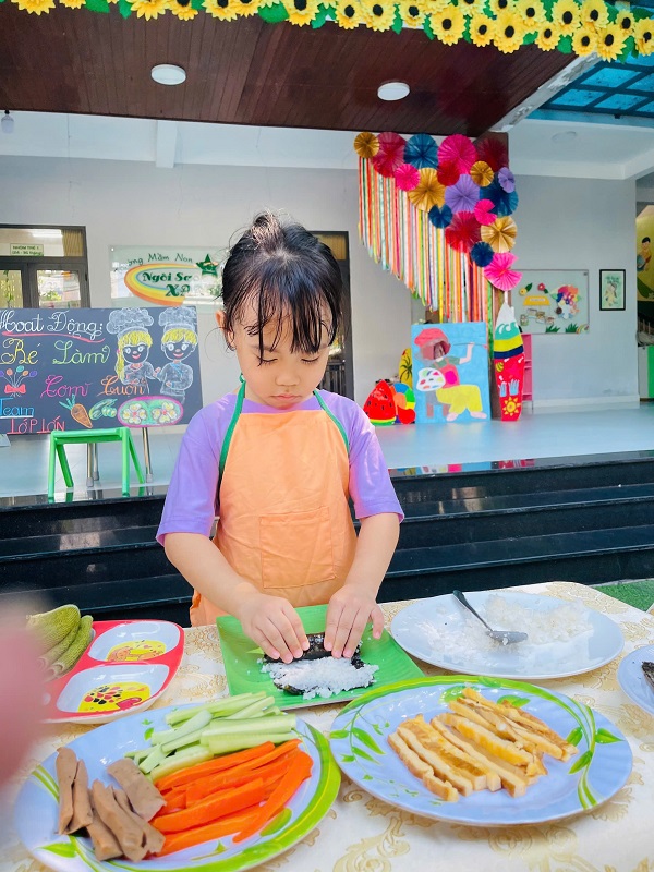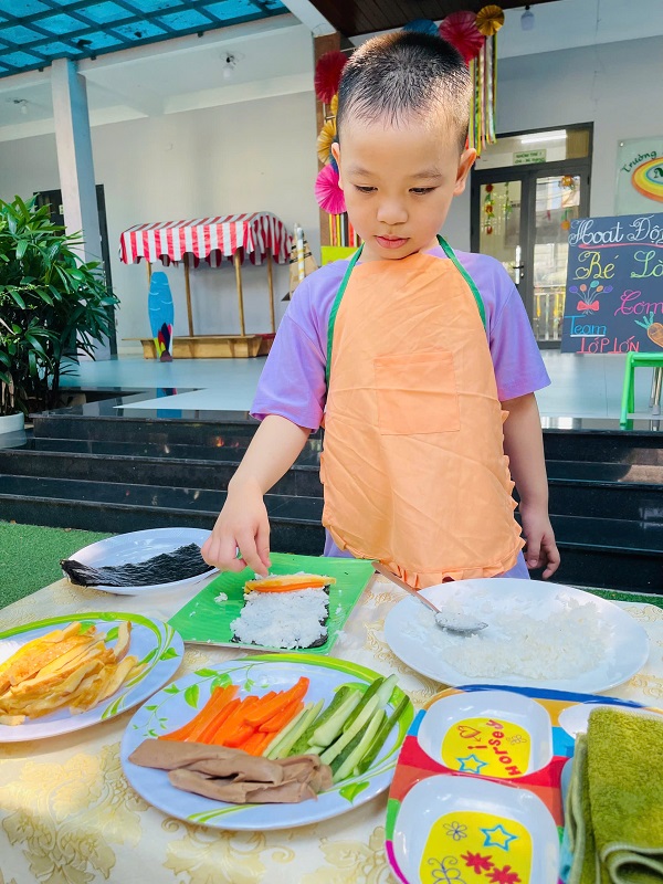Các bạn lớp MG Lớn được trải nghiệm làm cơm cuộn rất là thích thú. Chúc các con ngon miệng.