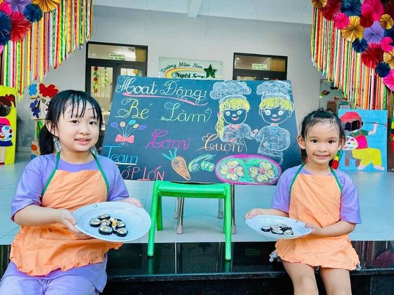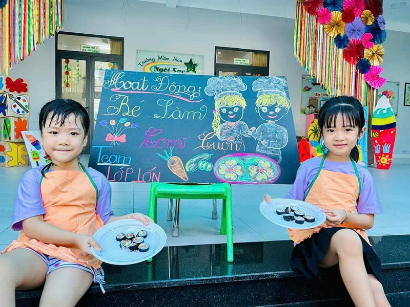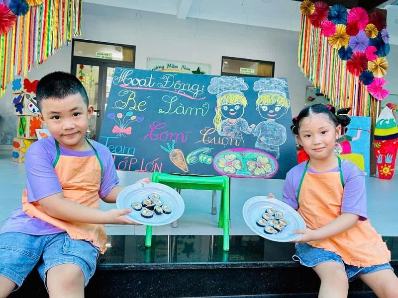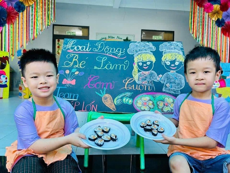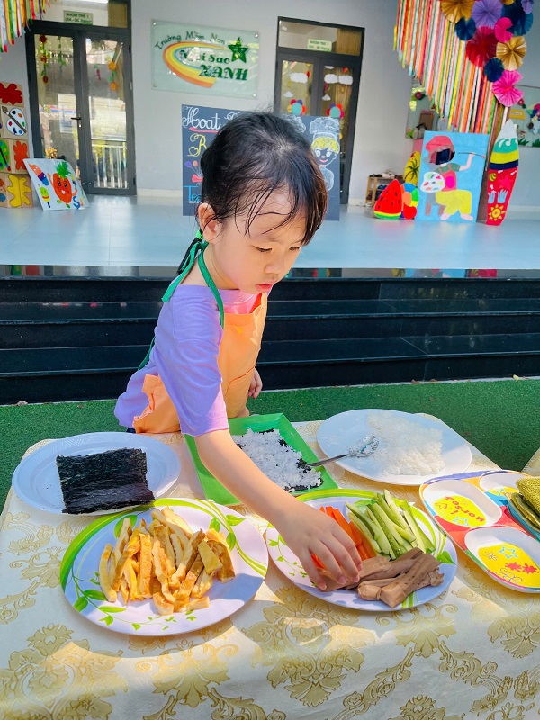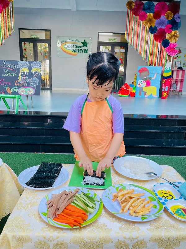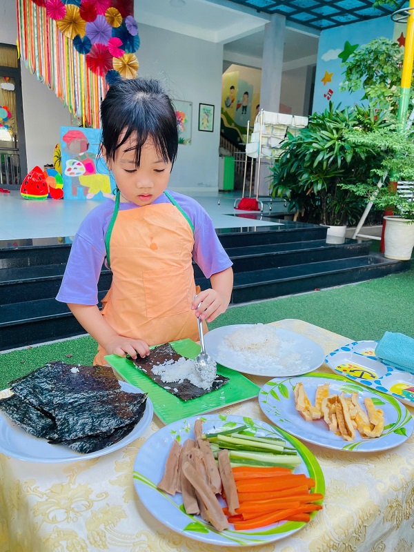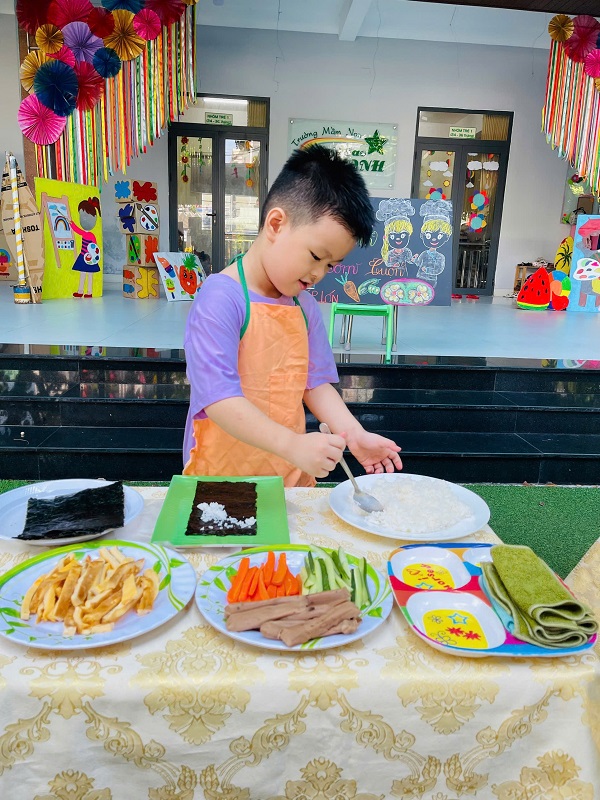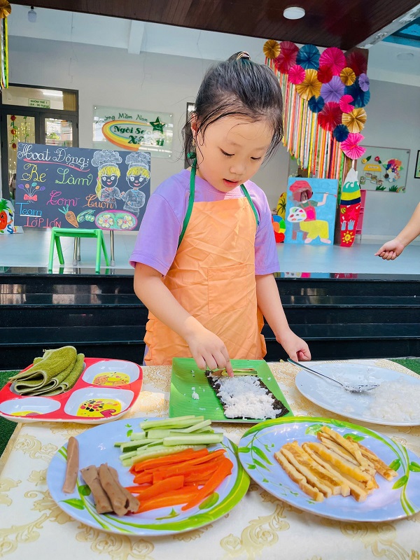 Các bạn lớp MG Lớn được trải nghiệm làm cơm cuộn rất là thích thú. Chúc các con ngon miệng.