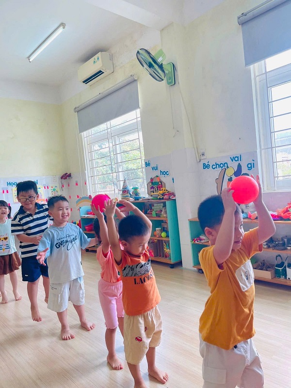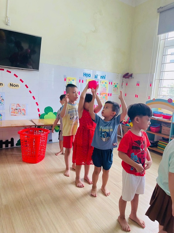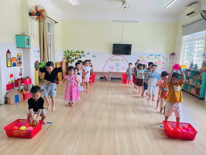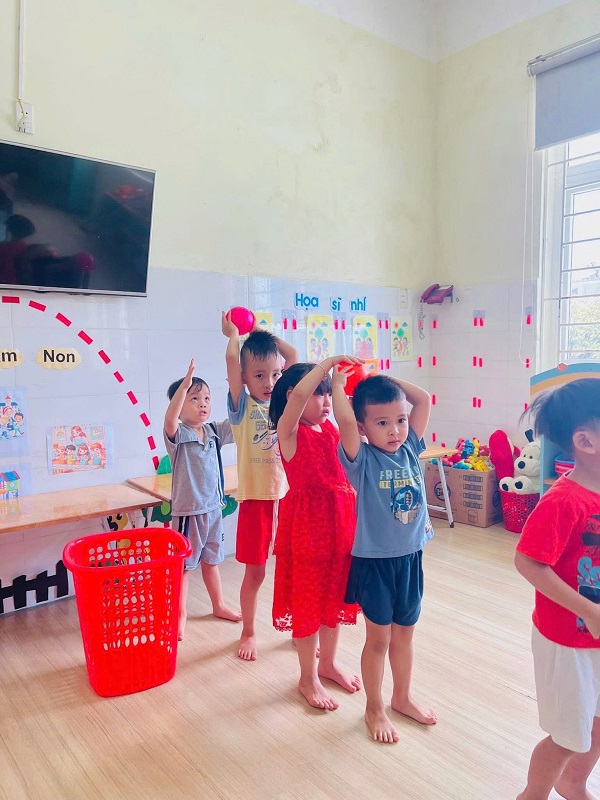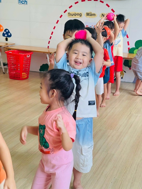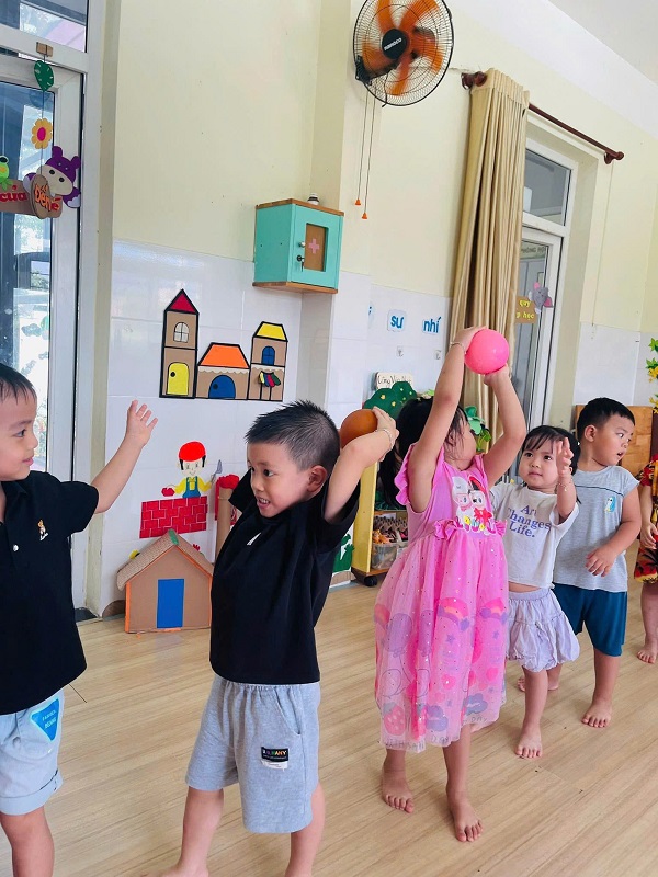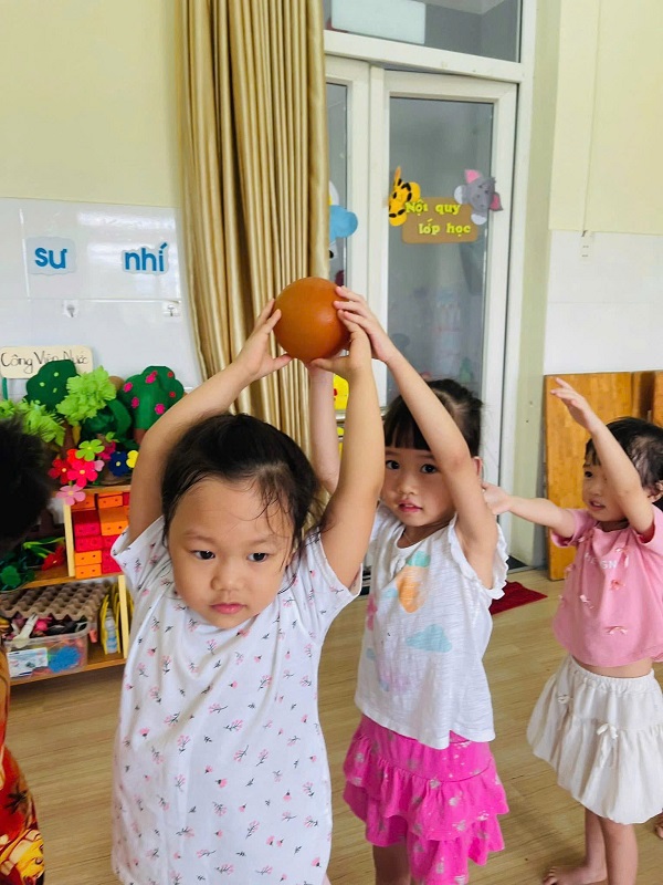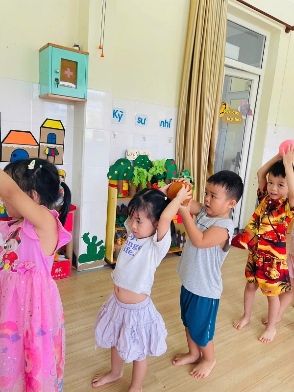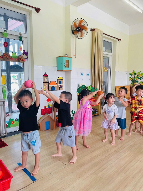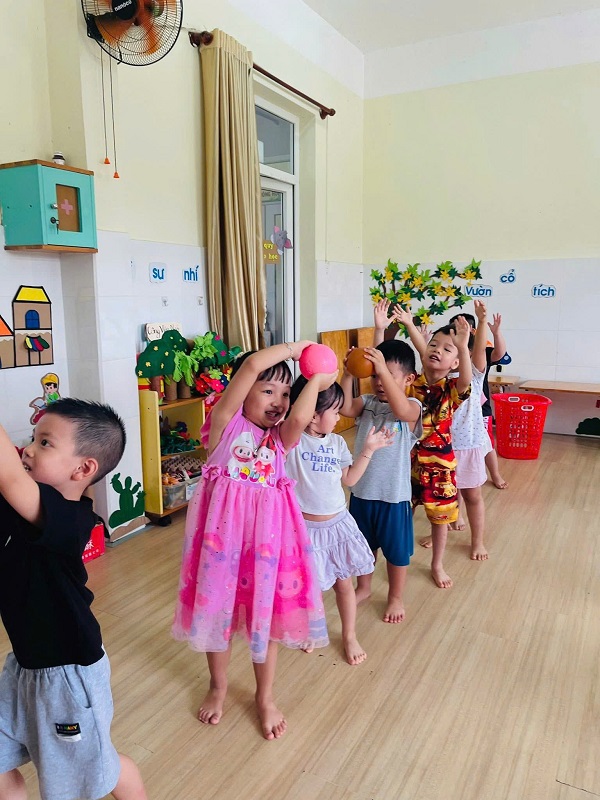 Các bạn lớp Nhỡ 2 học tiết thể dục: "Chuyền bóng qua đầu" và Trò chơi vận động: "Kiến tha mồi về tổ".