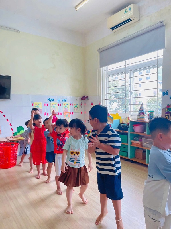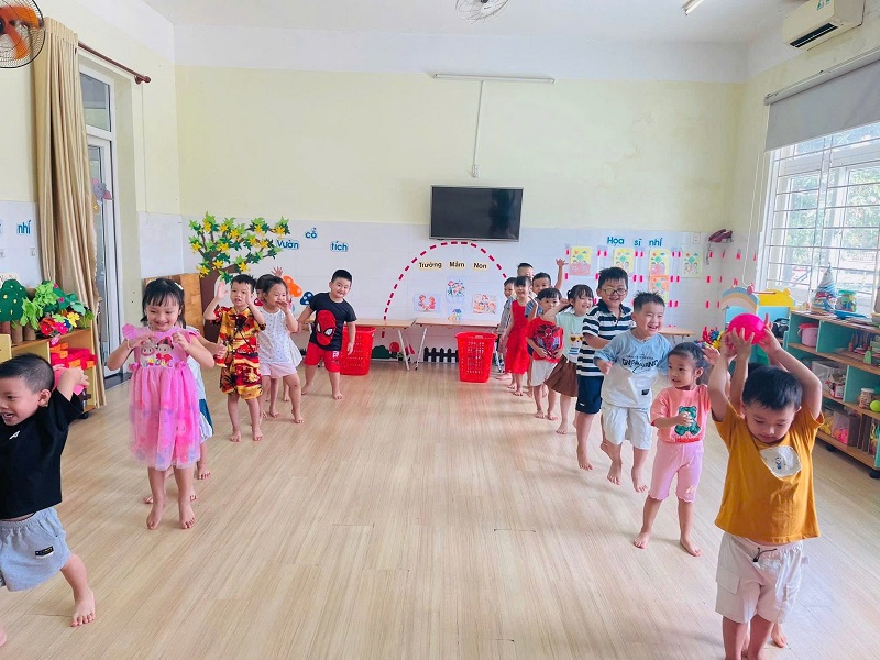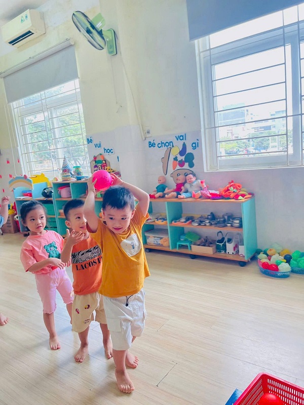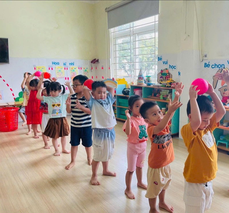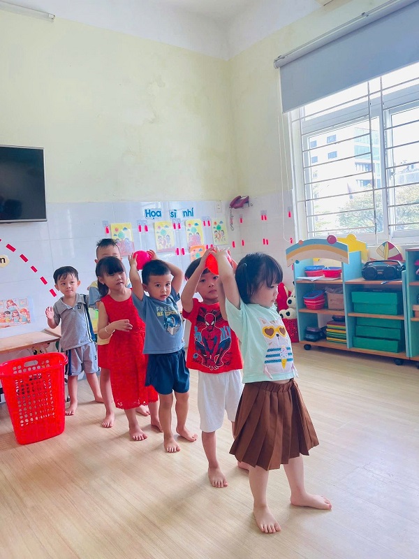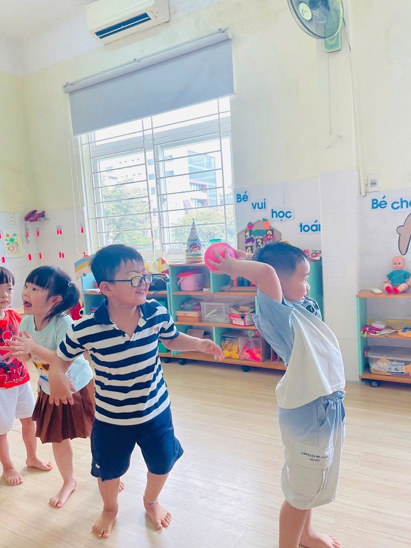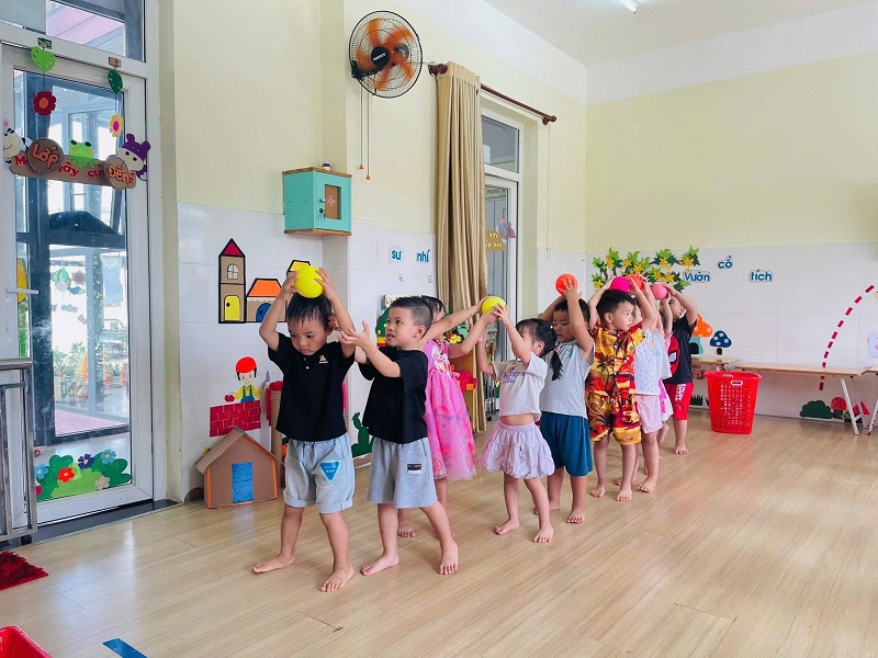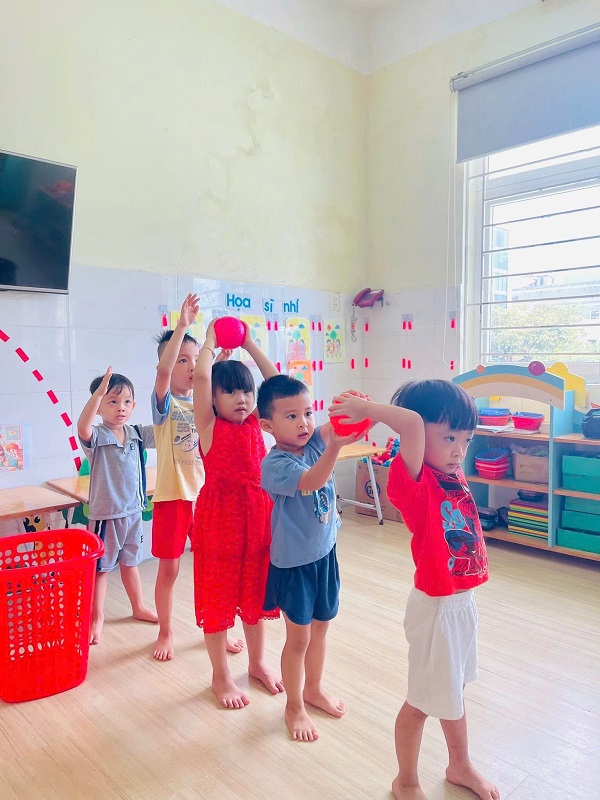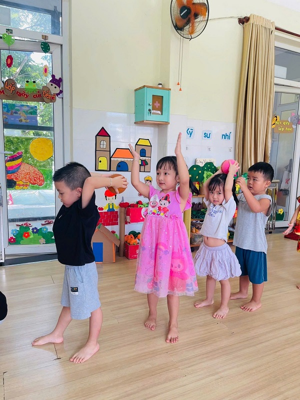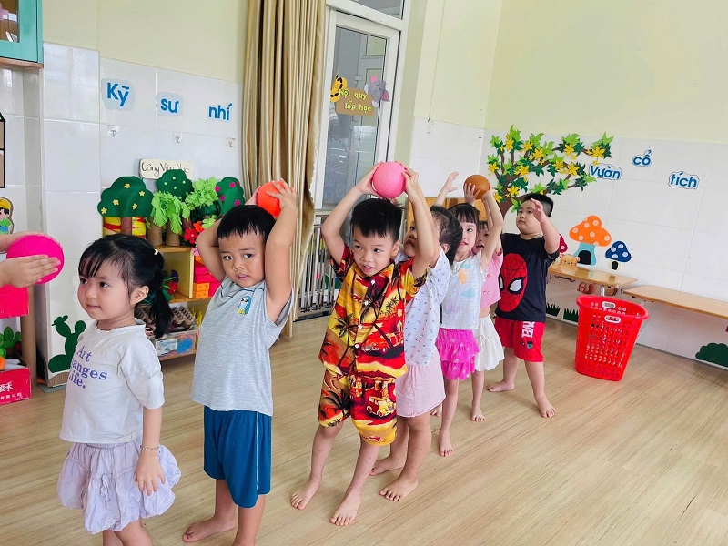 Các bạn lớp Nhỡ 2 học tiết thể dục: "Chuyền bóng qua đầu" và Trò chơi vận động: "Kiến tha mồi về tổ".
