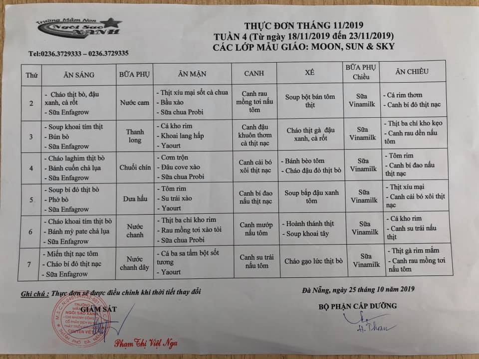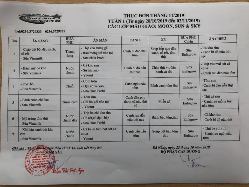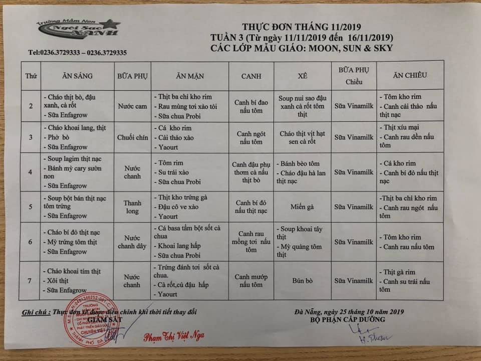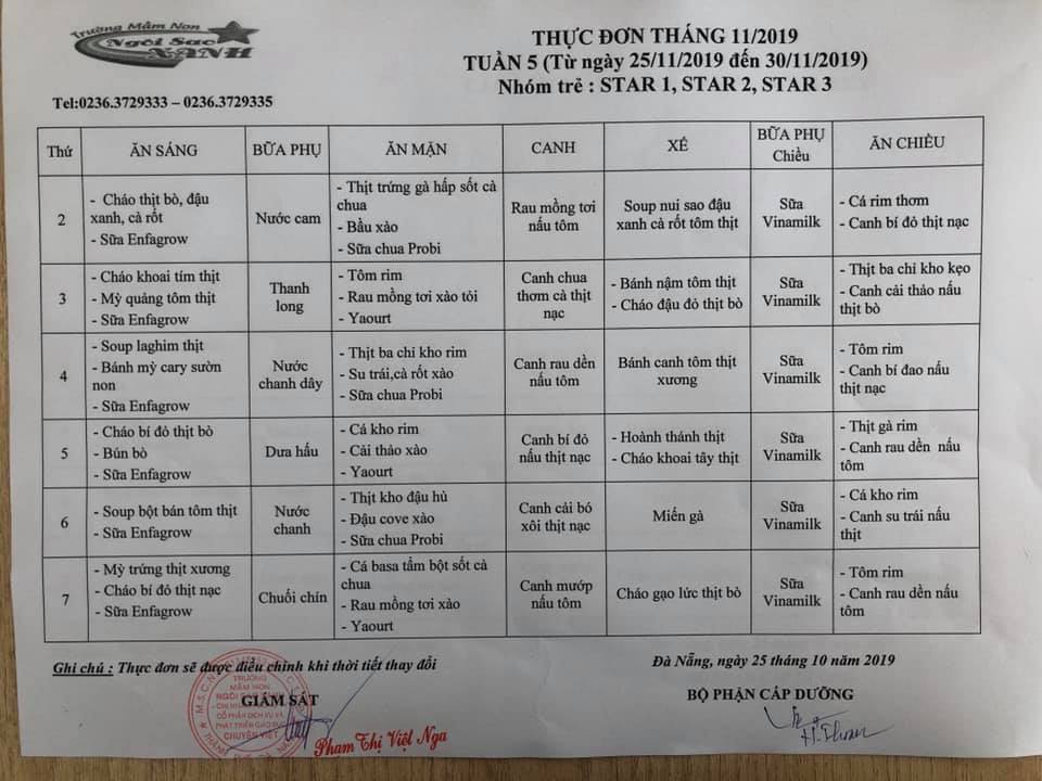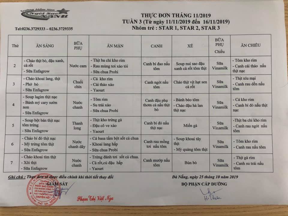 THỰC ĐƠN THÁNG 11 NĂM 2019 CỦA CÁC BÉ