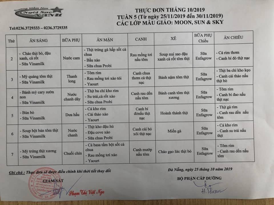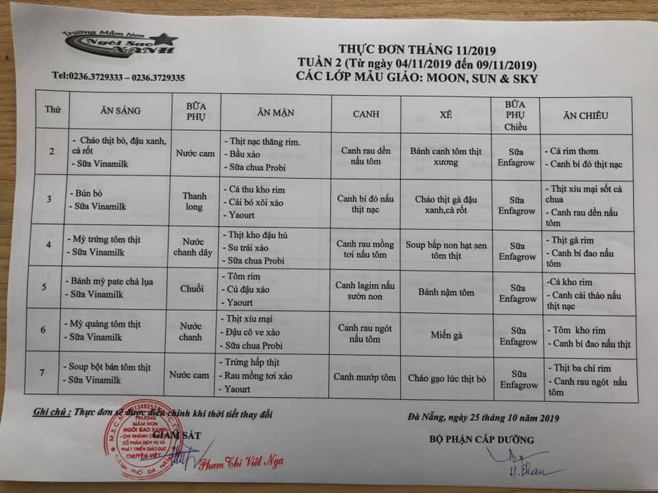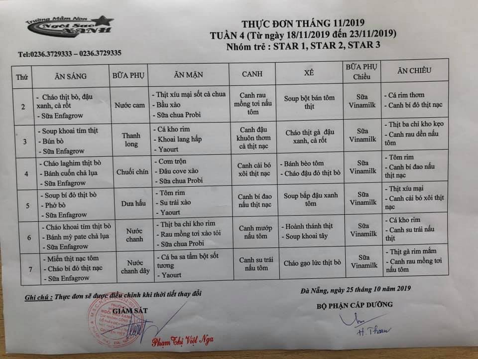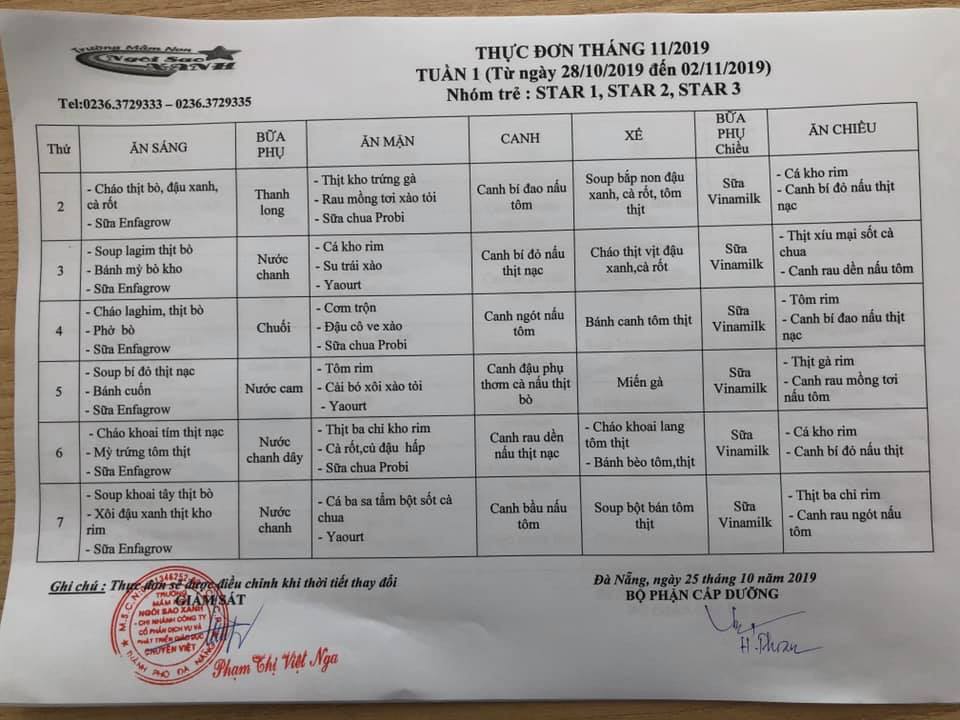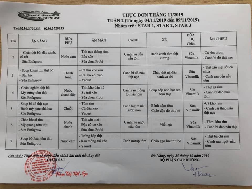 THỰC ĐƠN THÁNG 11 NĂM 2019 CỦA CÁC BÉ
