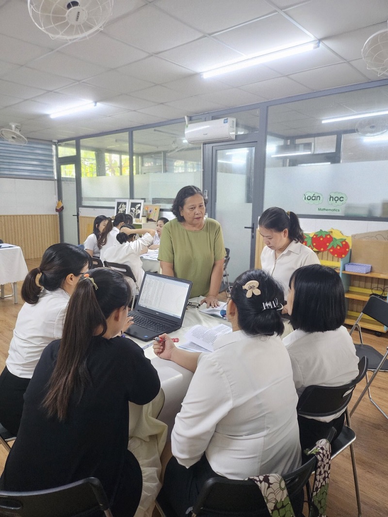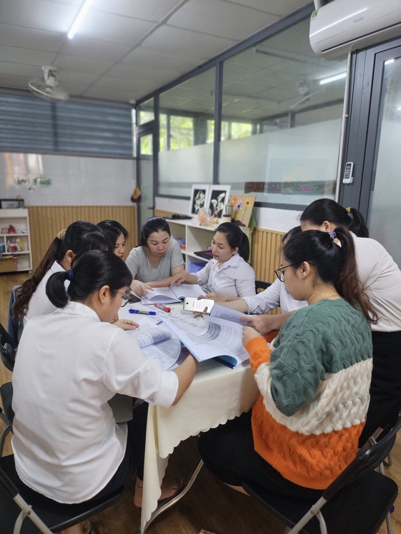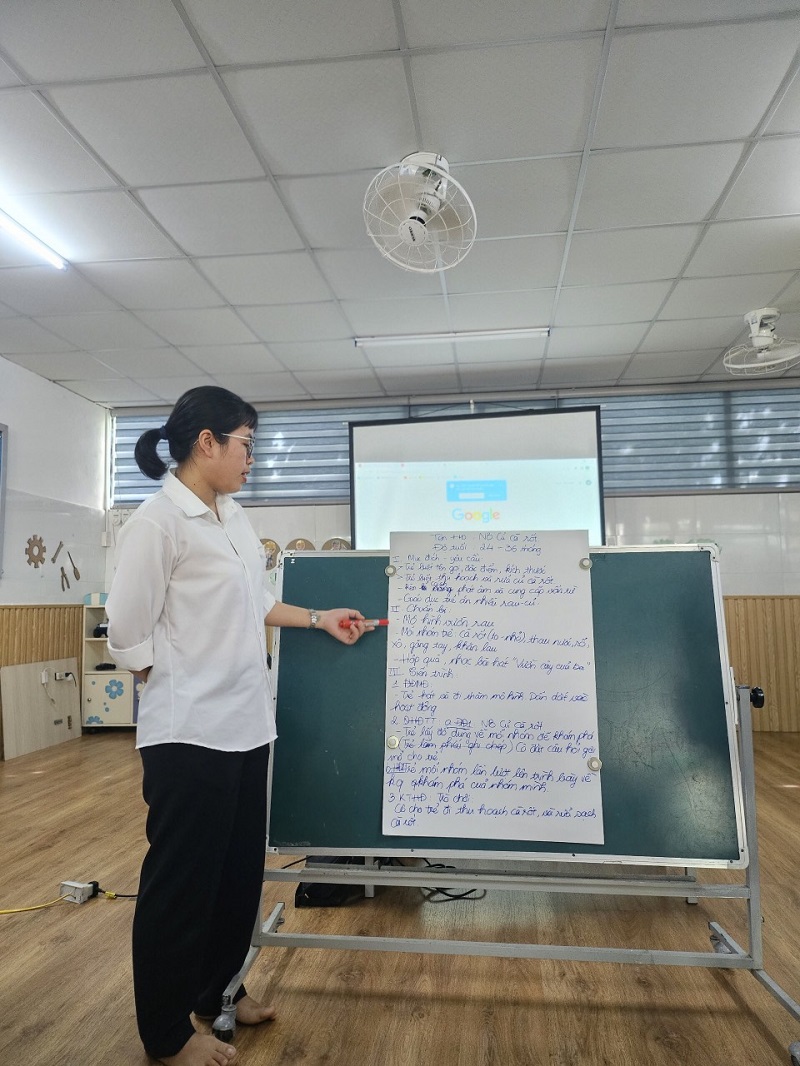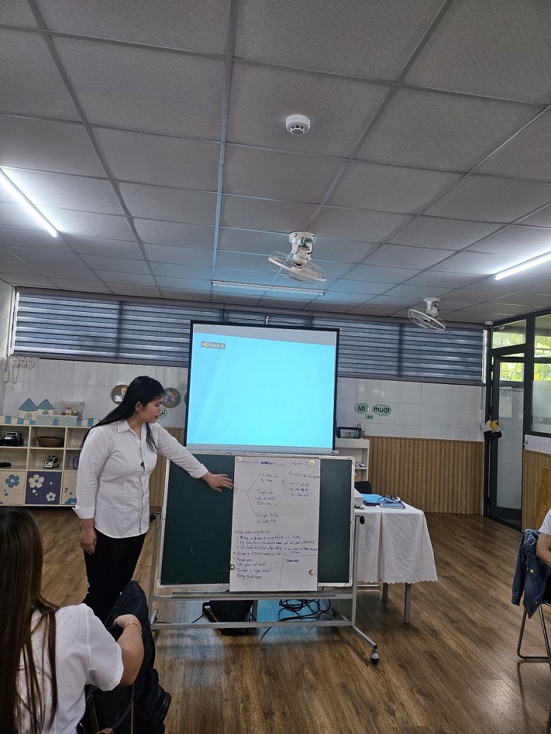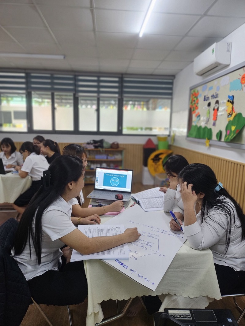 Công tác bồi dưỡng chuyên môn cho đội ngũ giáo viên ở trường mầm non là nhiệm vụ hàng đầu nhằm nâng cao chất lượng chất lượng đội ngũ, khắc phục những khó khăn, hạn chế trong quá trình chăm sóc, giáo dục trẻ. Góp phần đáp ứng yêu cầu đổi mới trong giáo dục mầm non, nâng cao phẩm chất đạo đức, trình độ chuyên môn nghiệp vụ sư phạm của đội ngũ giáo viên. Ngày 3 tháng 12 năm 2023, trường Mầm Non Ngôi Sao Xanh đã xây dựng và triển khai kế hoạch sinh hoạt chuyên môn cho giáo viên trong năm học 2023-2024. Dưới hình thức sinh hoạt theo hướng nghiên cứu bài học, tại buổi sinh hoạt giáo viên đã tham gia trao đổi, thảo luận sôi nổi, chia sẻ những kinh nghiệm thực tiễn từ đó góp phần nâng cao hiệu quả trong công tác chăm sóc giáo dục trẻ của bản thân nói riêng và của nhà trường nói chung. Trong đợt sinh hoạt này nhà trường đã đi sâu vào các nội dung sau: 1. Ứng dụng giáo dục STEAM trong thực hiện chương trình giáo dục mầm non. 2. Ứng dụng công nghệ thông tin trong phát triển tài liệu bồi dưỡng chuyên môn cho giáo viên mầm non. Dưới đây là một số hình ảnh của buổi sinh hoạt chuyên môn:
