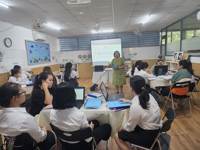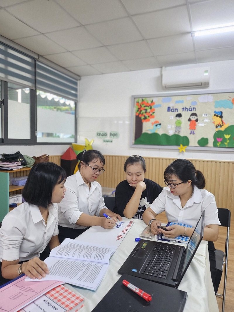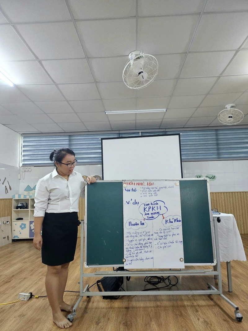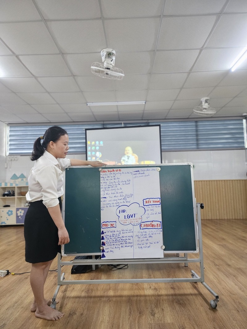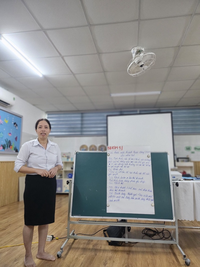 Công tác bồi dưỡng chuyên môn cho đội ngũ giáo viên ở trường mầm non là nhiệm vụ hàng đầu nhằm nâng cao chất lượng chất lượng đội ngũ, khắc phục những khó khăn, hạn chế trong quá trình chăm sóc, giáo dục trẻ. Góp phần đáp ứng yêu cầu đổi mới trong giáo dục mầm non, nâng cao phẩm chất đạo đức, trình độ chuyên môn nghiệp vụ sư phạm của đội ngũ giáo viên. Ngày 3 tháng 12 năm 2023, trường Mầm Non Ngôi Sao Xanh đã xây dựng và triển khai kế hoạch sinh hoạt chuyên môn cho giáo viên trong năm học 2023-2024. Dưới hình thức sinh hoạt theo hướng nghiên cứu bài học, tại buổi sinh hoạt giáo viên đã tham gia trao đổi, thảo luận sôi nổi, chia sẻ những kinh nghiệm thực tiễn từ đó góp phần nâng cao hiệu quả trong công tác chăm sóc giáo dục trẻ của bản thân nói riêng và của nhà trường nói chung. Trong đợt sinh hoạt này nhà trường đã đi sâu vào các nội dung sau: 1. Ứng dụng giáo dục STEAM trong thực hiện chương trình giáo dục mầm non. 2. Ứng dụng công nghệ thông tin trong phát triển tài liệu bồi dưỡng chuyên môn cho giáo viên mầm non. Dưới đây là một số hình ảnh của buổi sinh hoạt chuyên môn:
