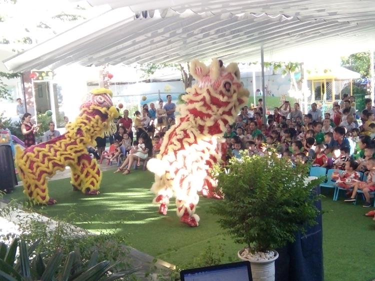 (Đội lân sư rồng "Thiên An" biểu diễn tại trường mầm non Ngôi Sao Xanh)