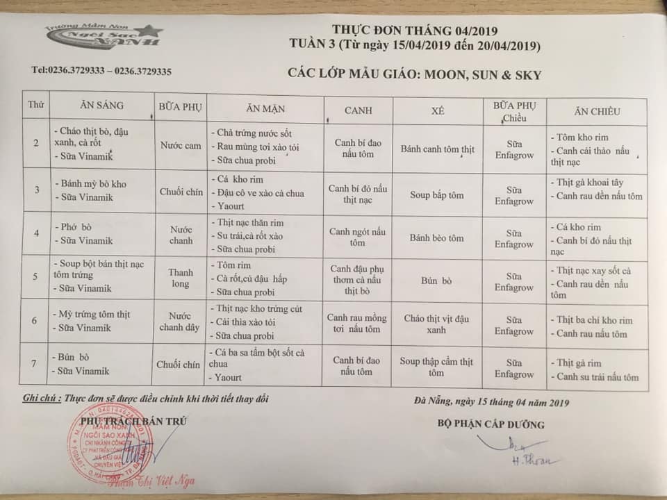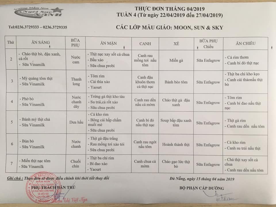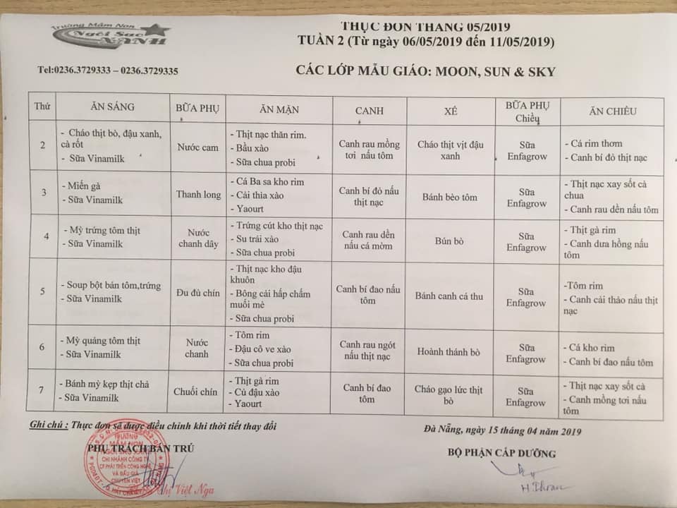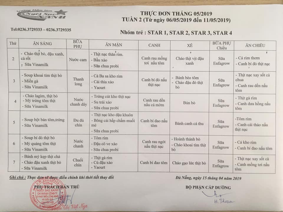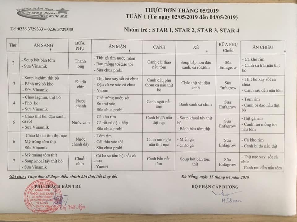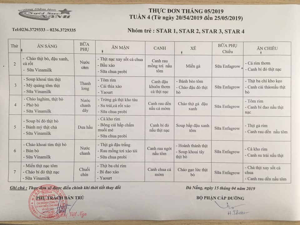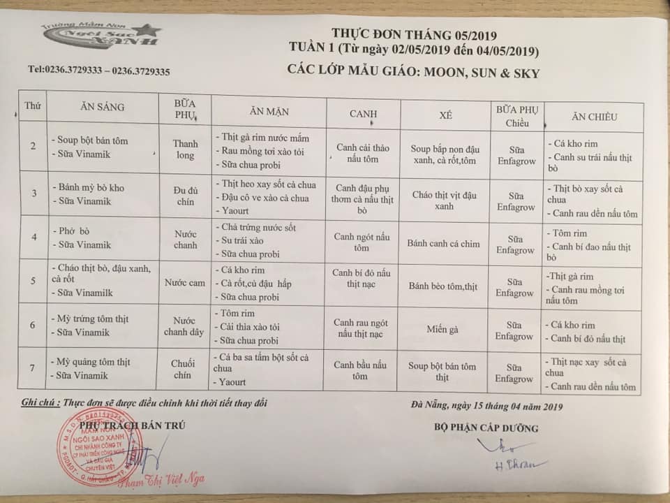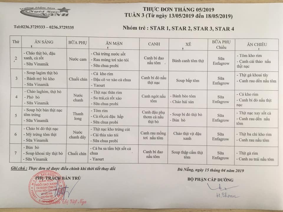THỰC ĐƠN THÁNG 05 NĂM 2019 CỦA CÁC BÉ