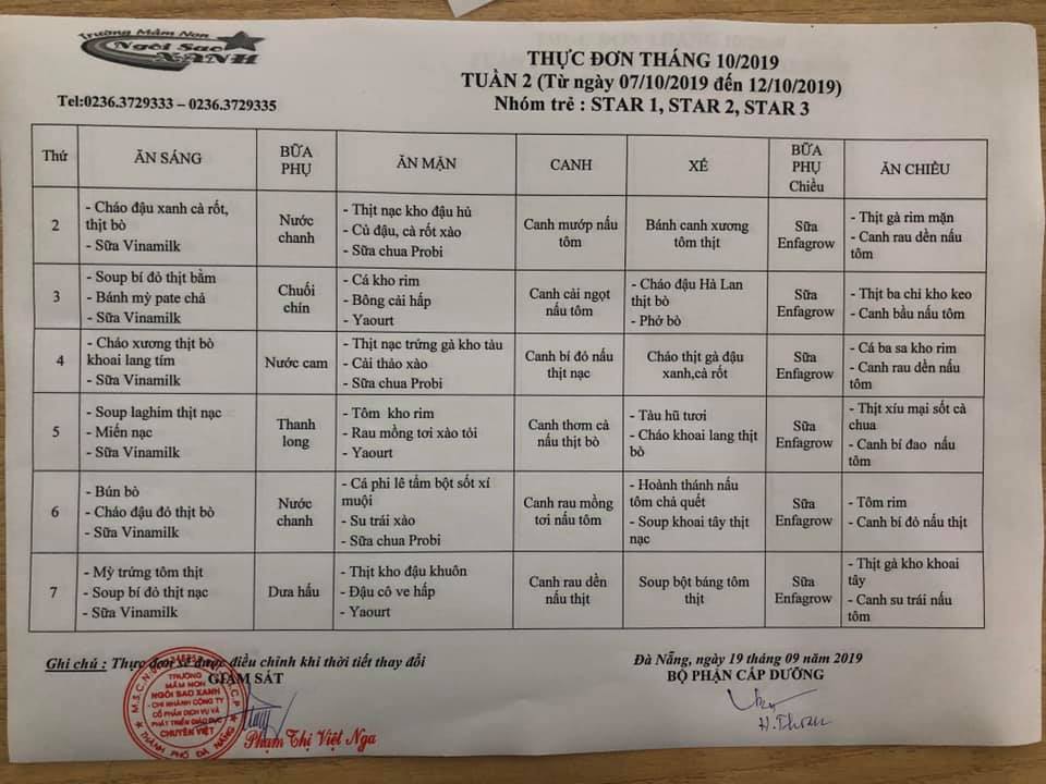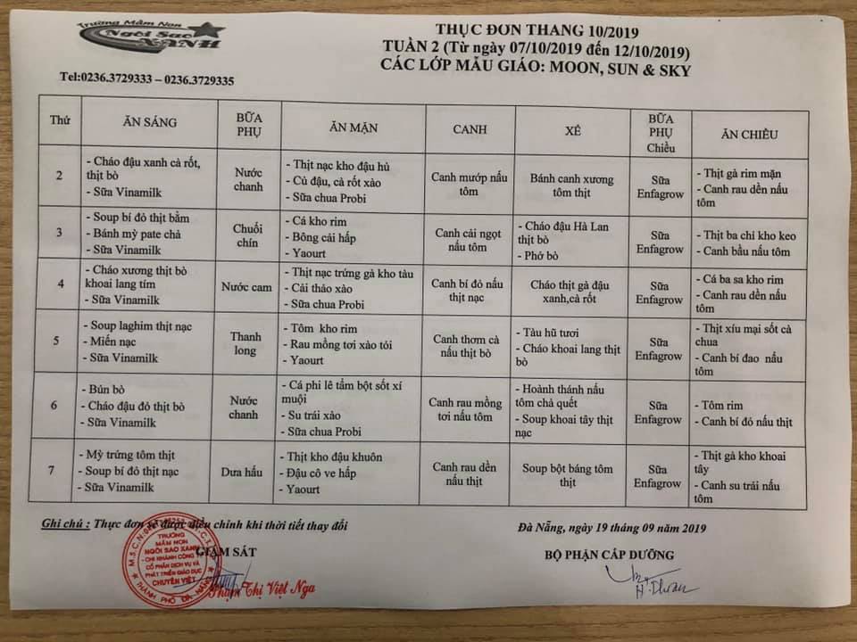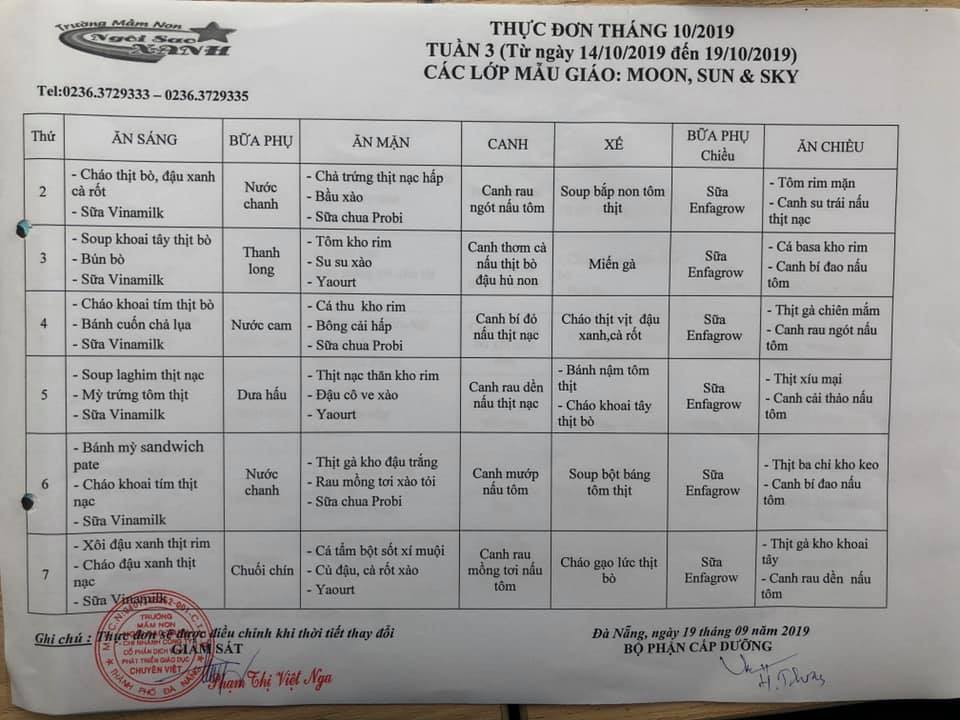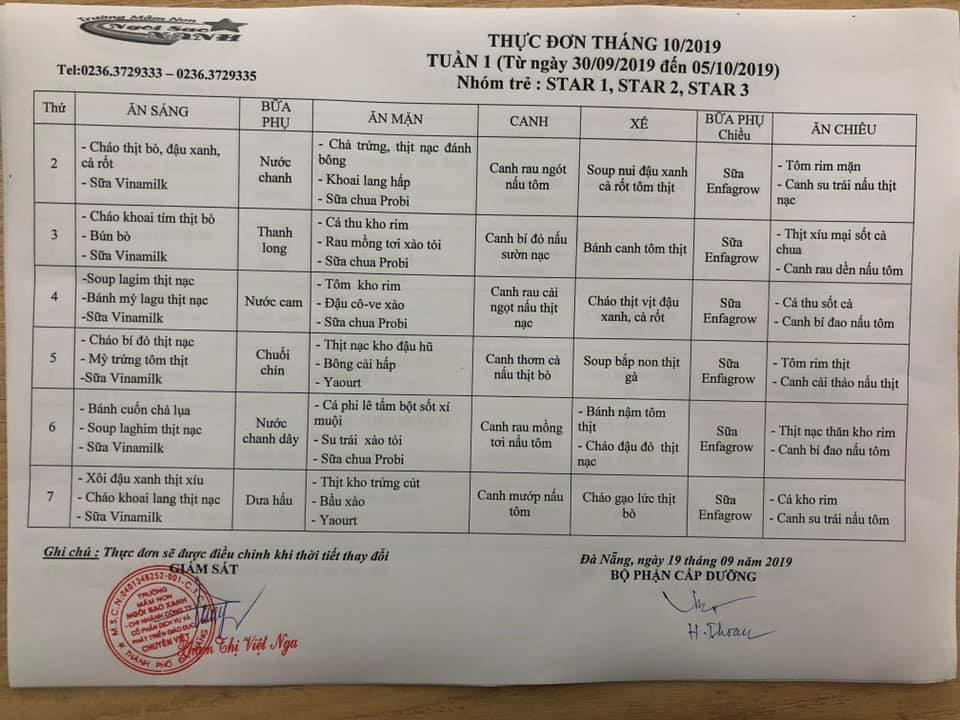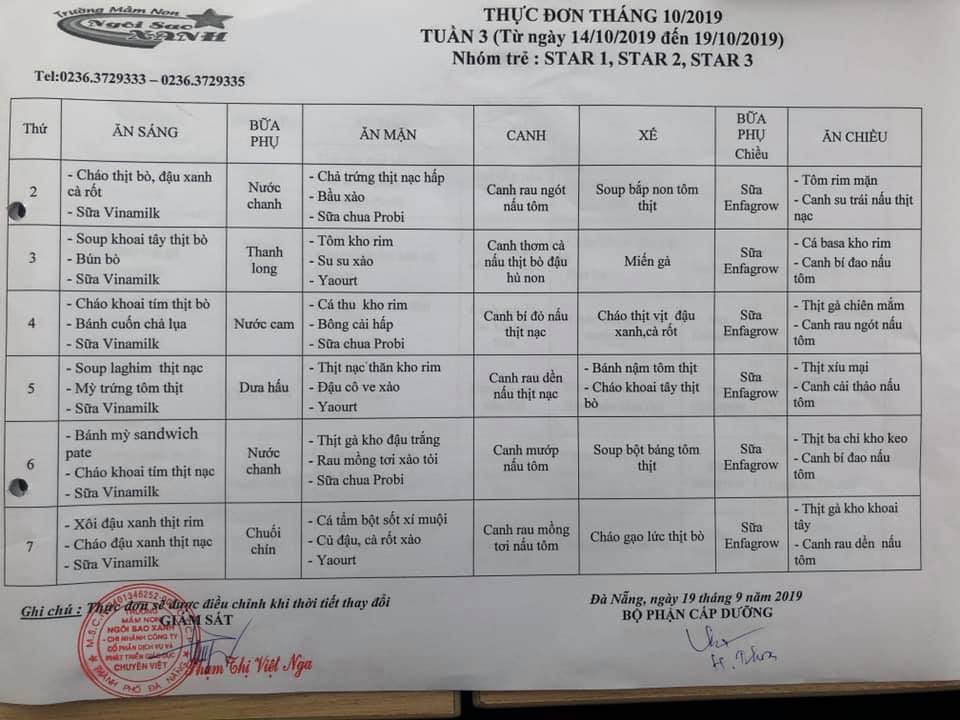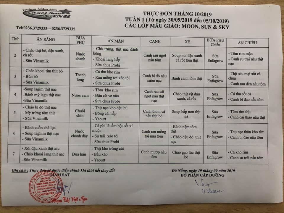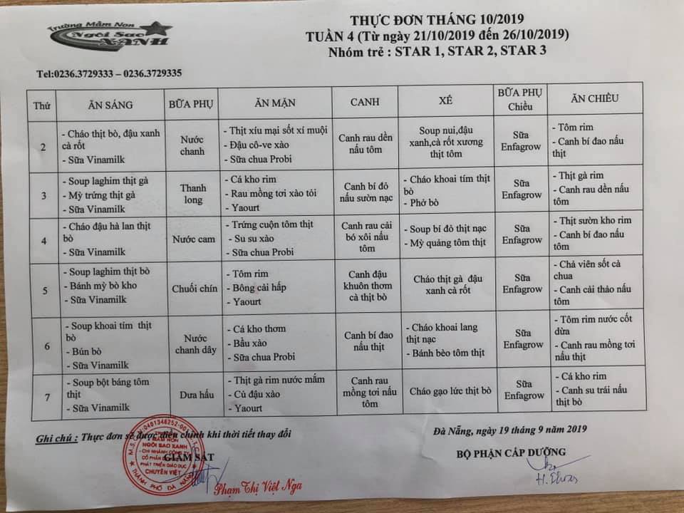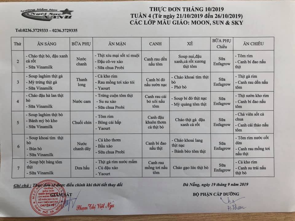 THỰC ĐƠN THÁNG 10 NĂM 2019 CỦA CÁC BÉ