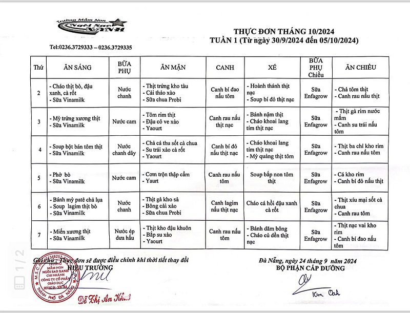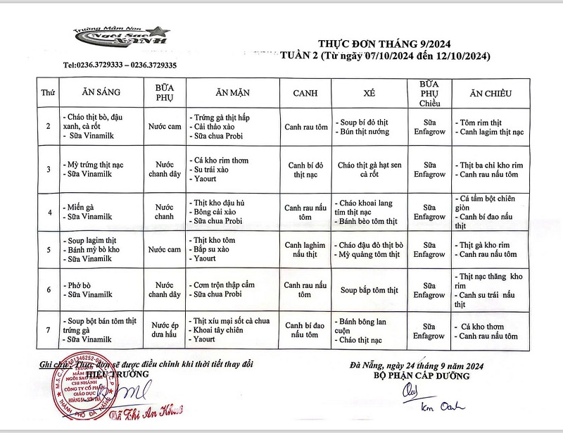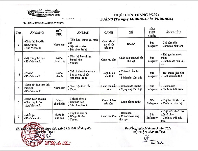 THỰC ĐƠN THÁNG 10 NĂM 2024 CỦA BÉ