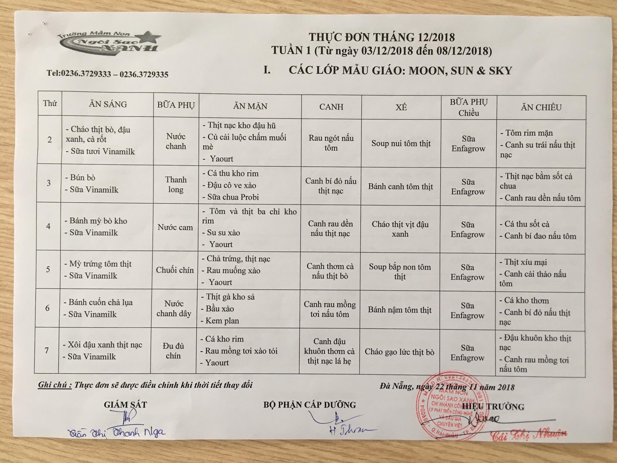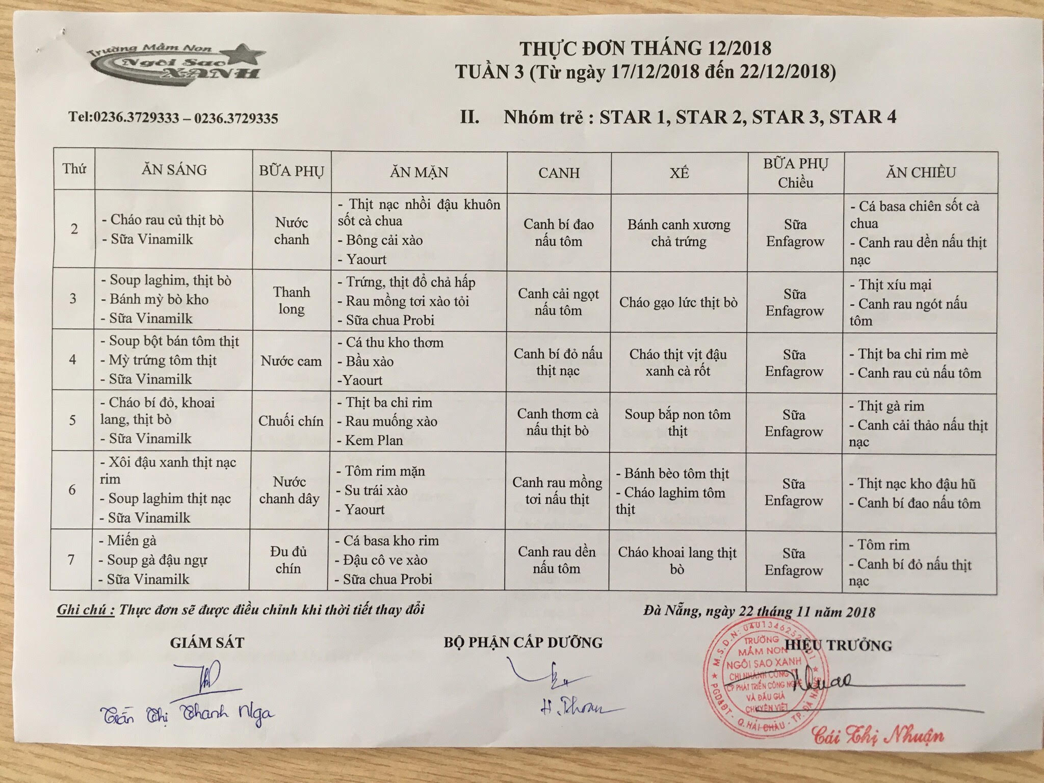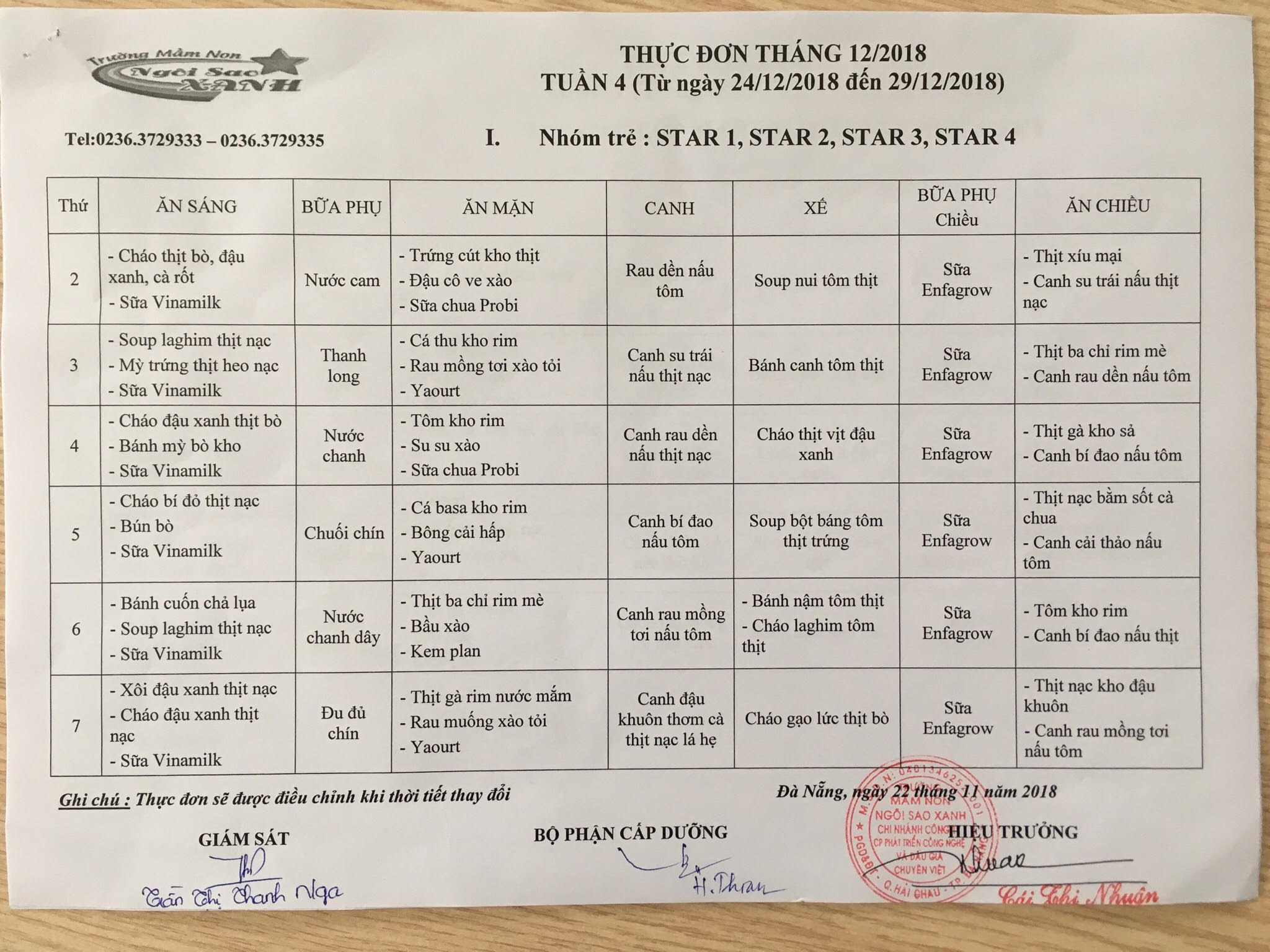 THỰC ĐƠN THÁNG 12 NĂM 2018 CỦA CÁC BÉ
