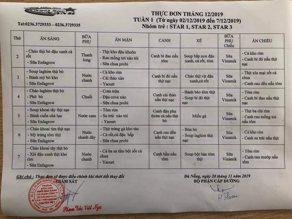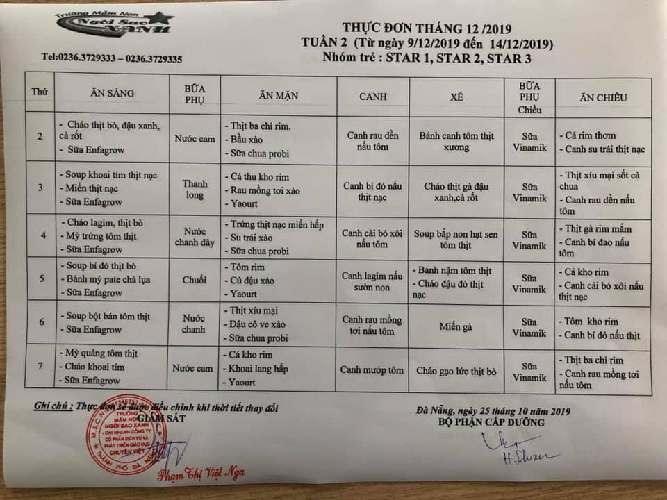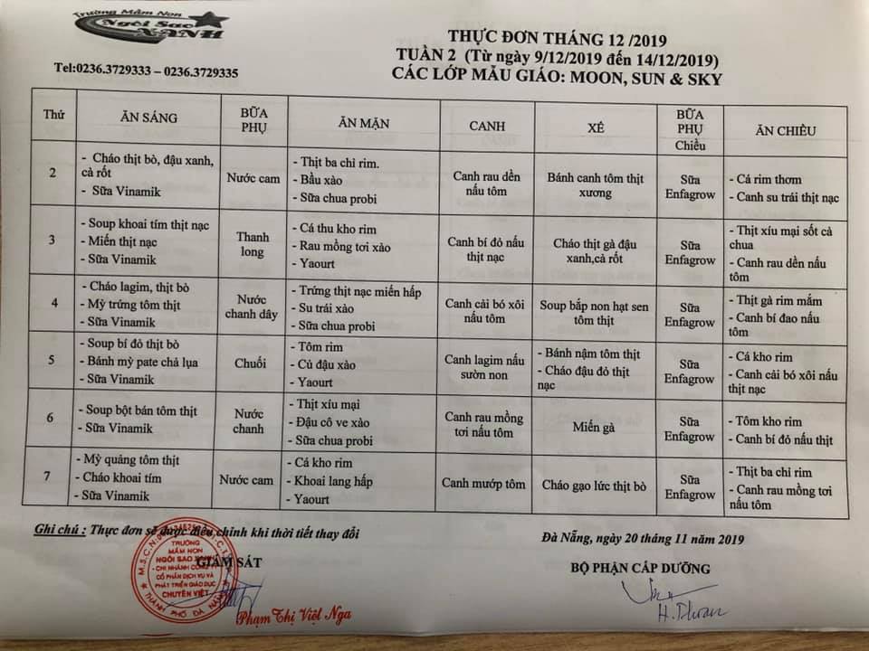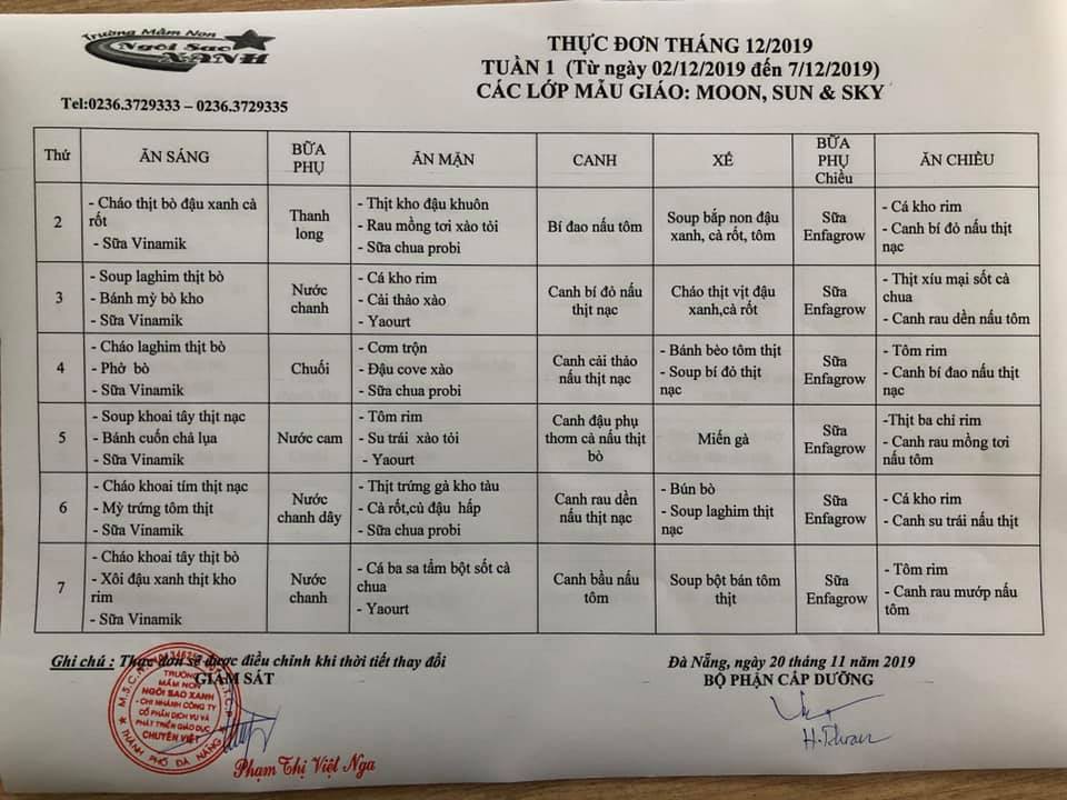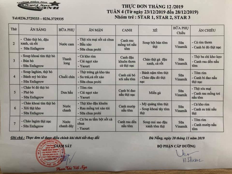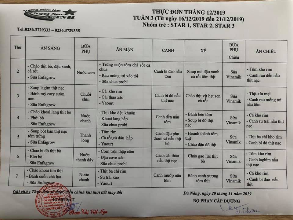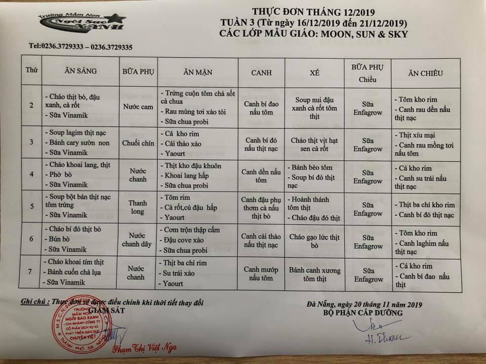 THỰC ĐƠN THÁNG 12 NĂM 2019 CỦA CÁC BÉ