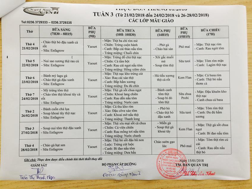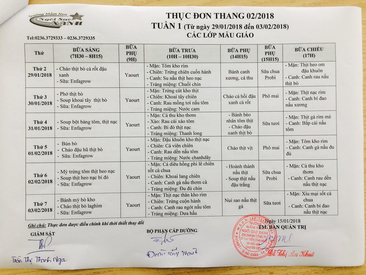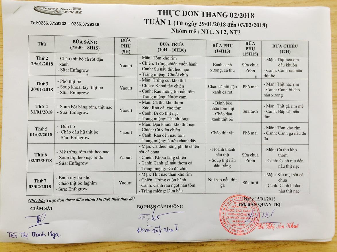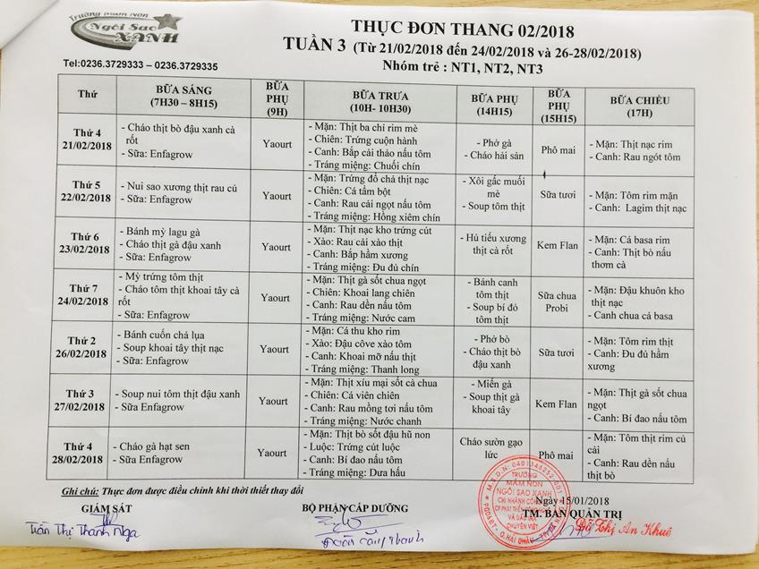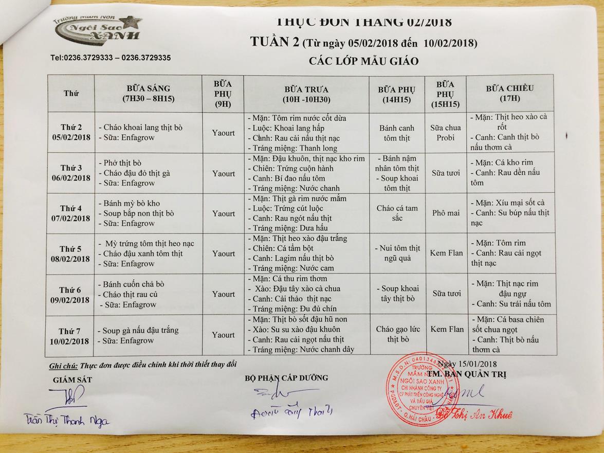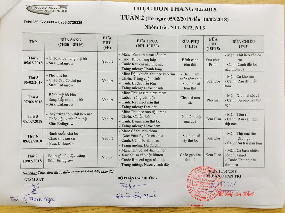 THỰC ĐƠN THÁNG 2 NĂM 2018 CỦA CÁC BÉ
