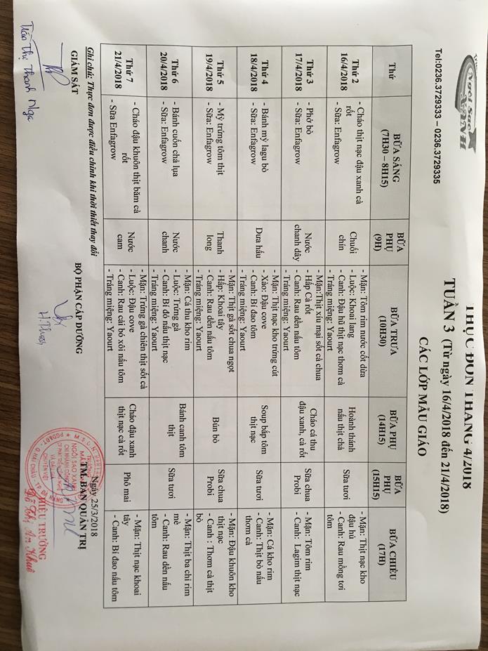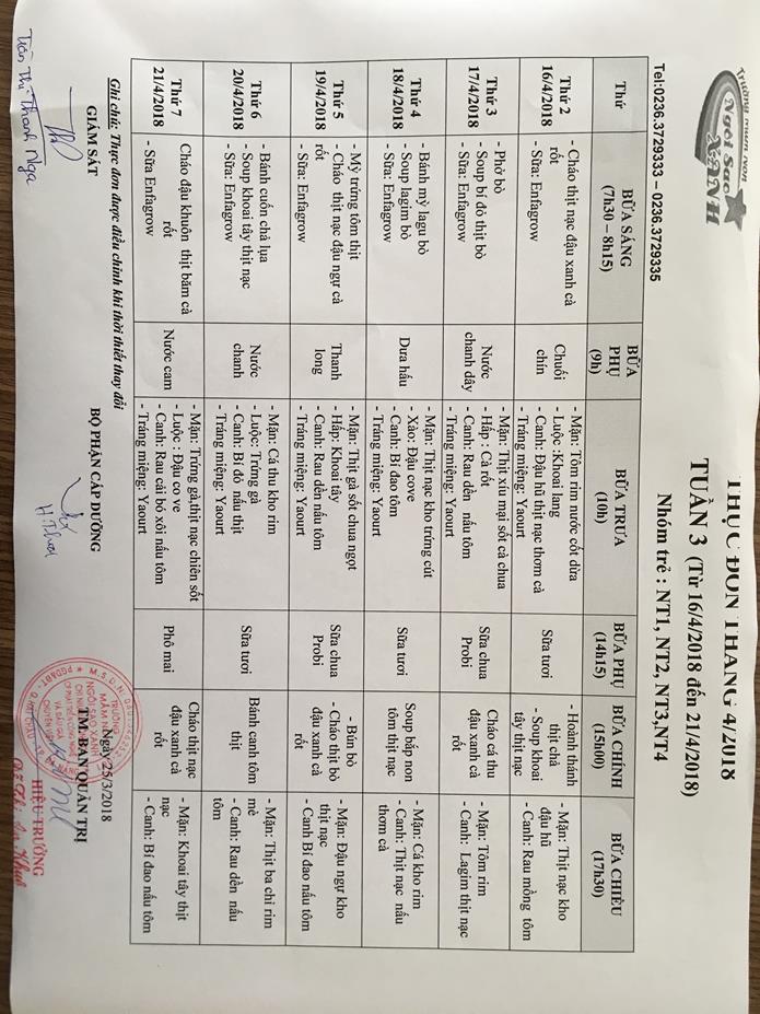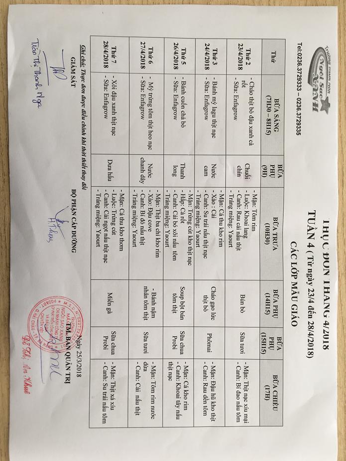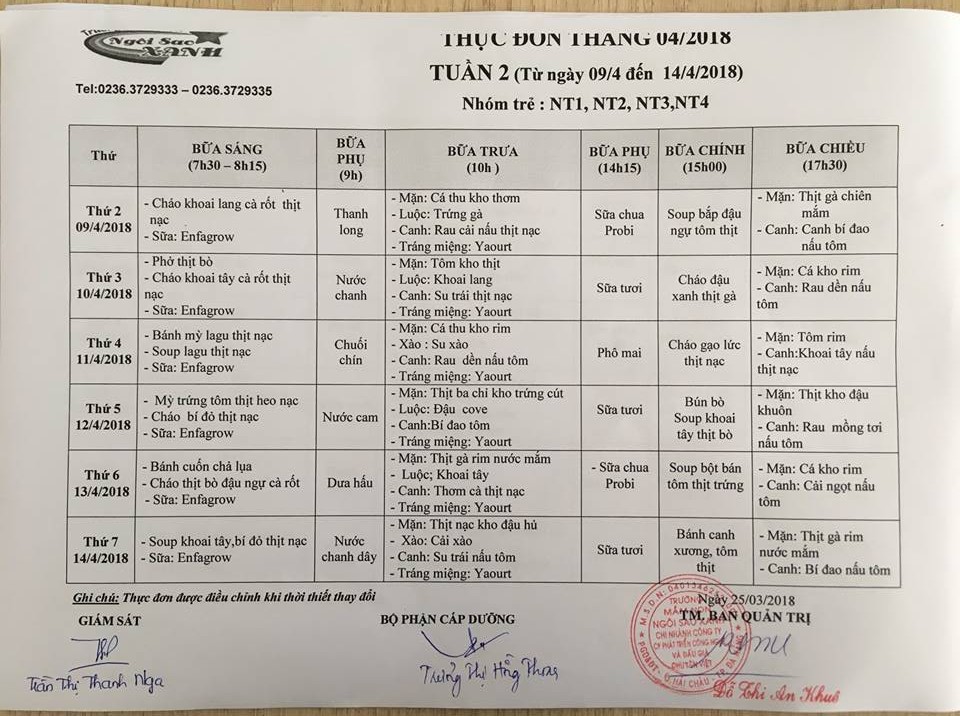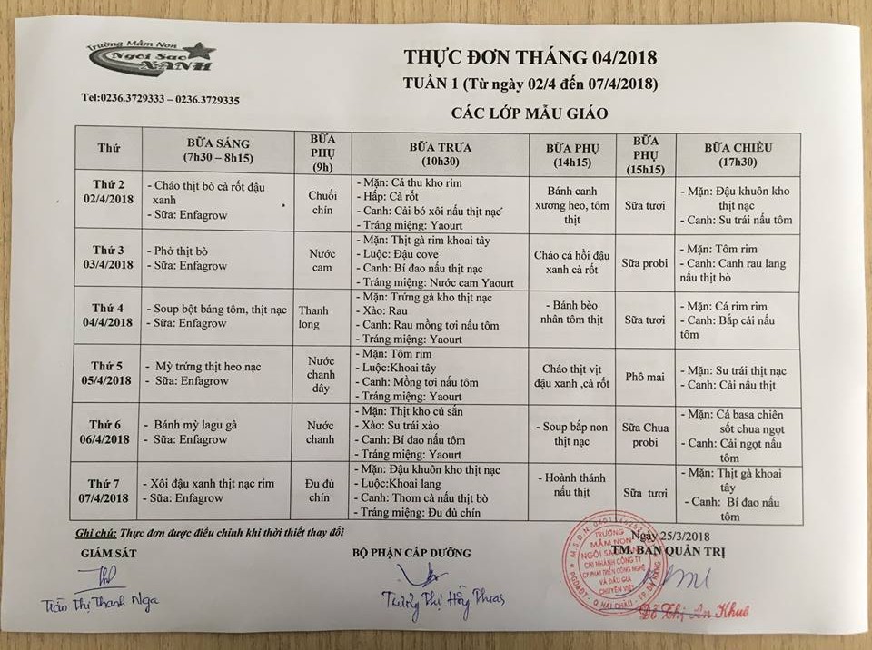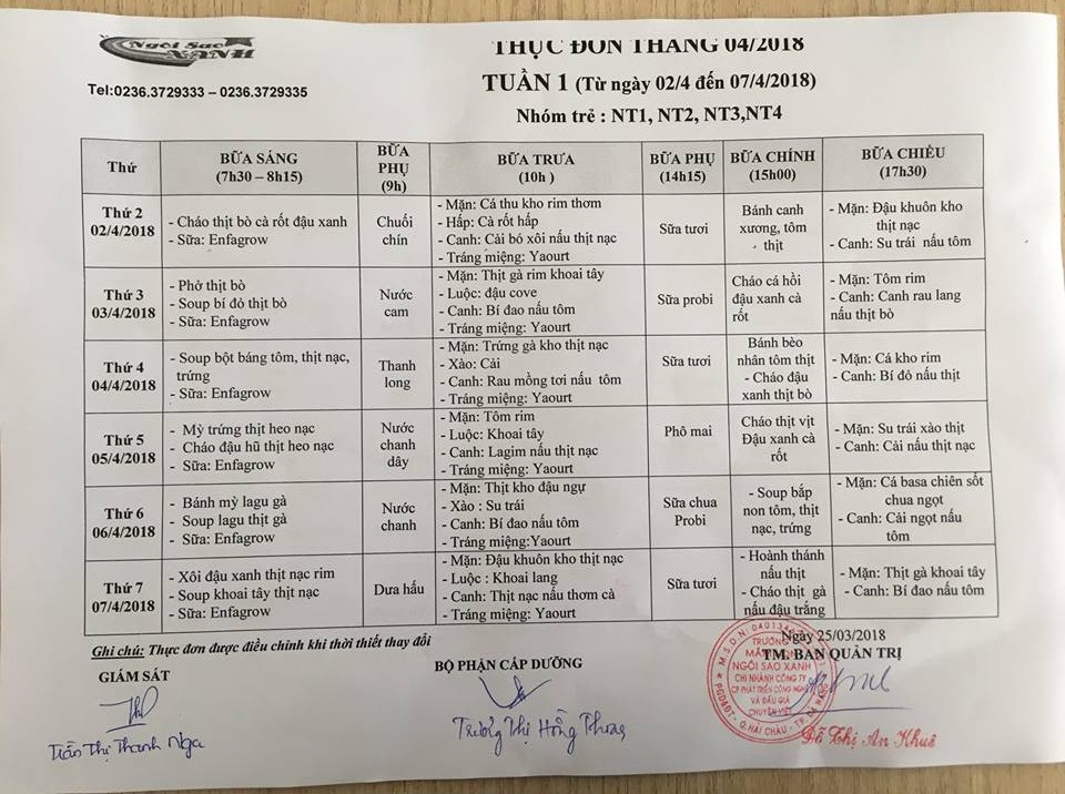 THỰC ĐƠN THÁNG 4 NĂM 2018 CỦA CÁC BÉ