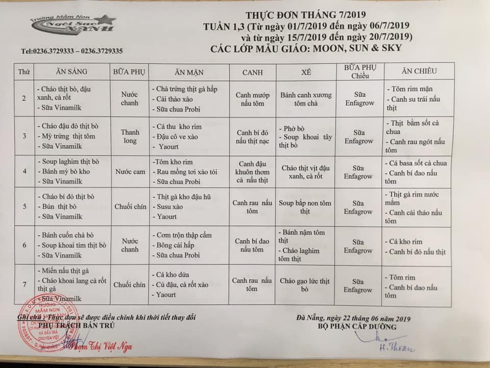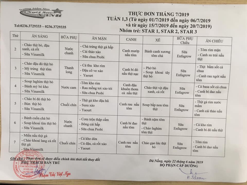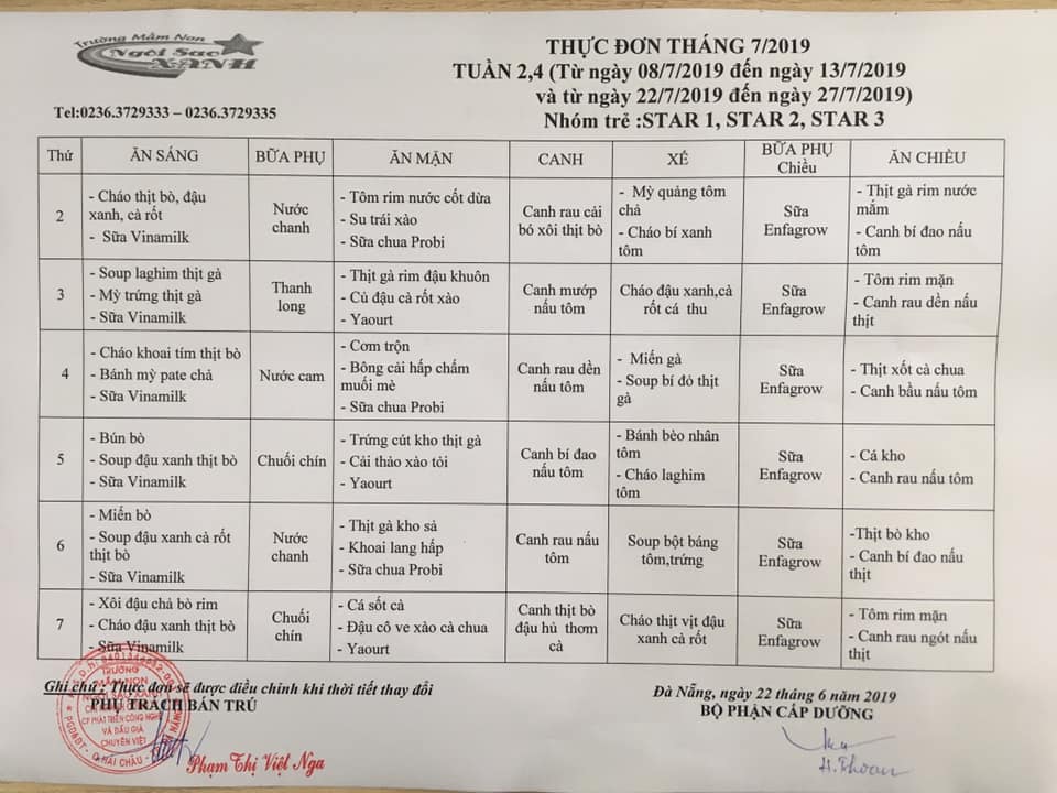 THỰC ĐƠN THÁNG 7 NĂM 2019 CỦA CÁC BÉ