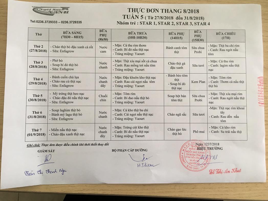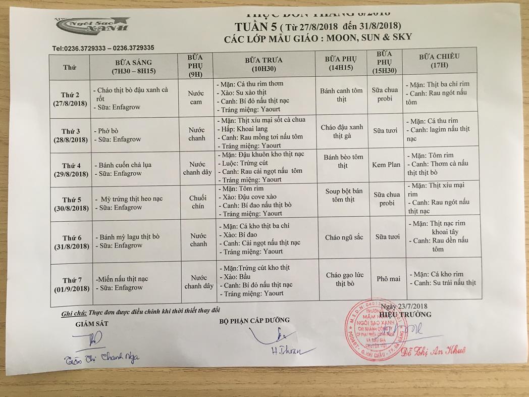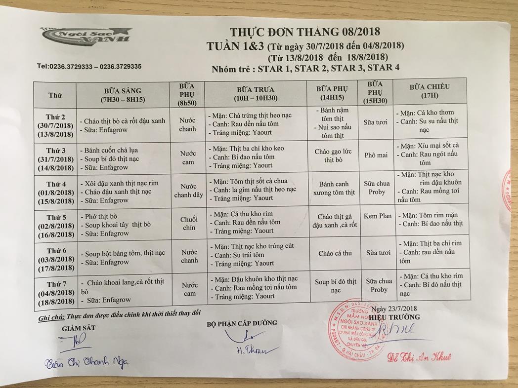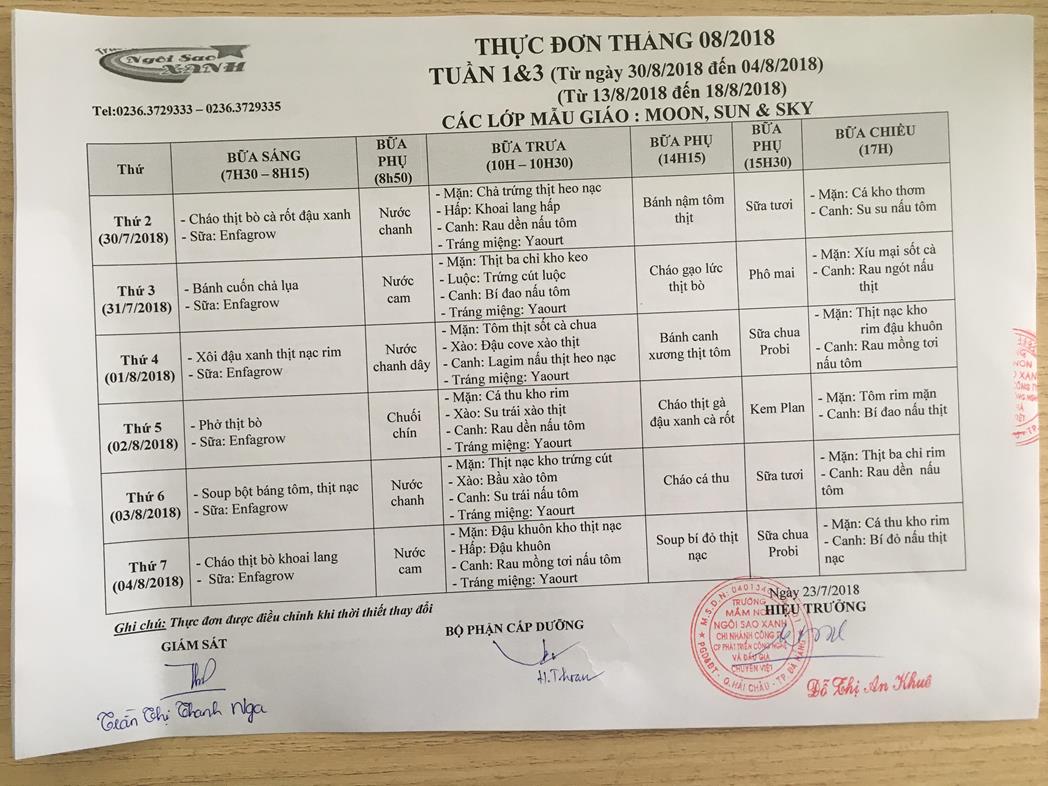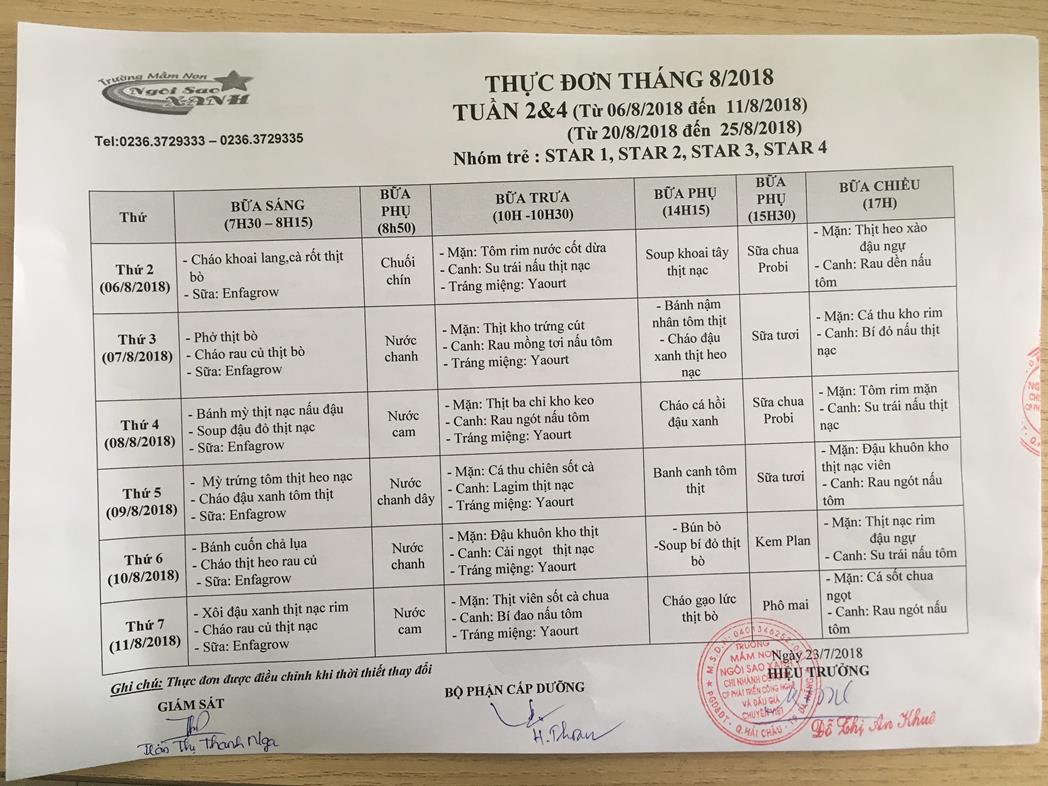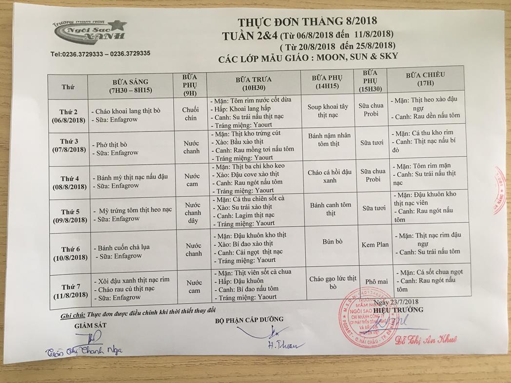 THỰC ĐƠN THÁNG 8 NĂM 2018 CỦA CÁC BÉ