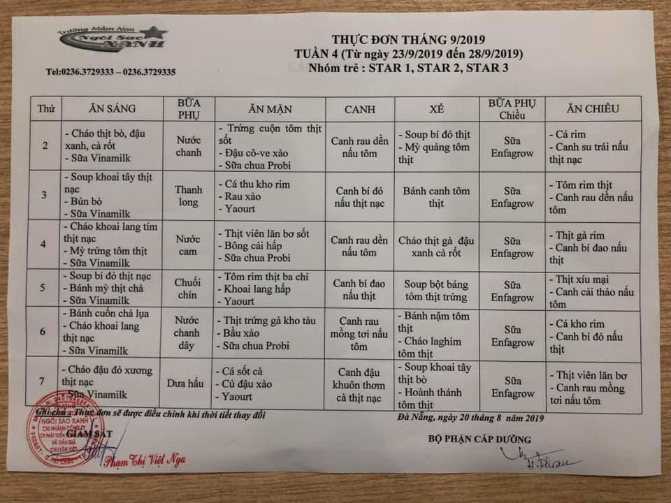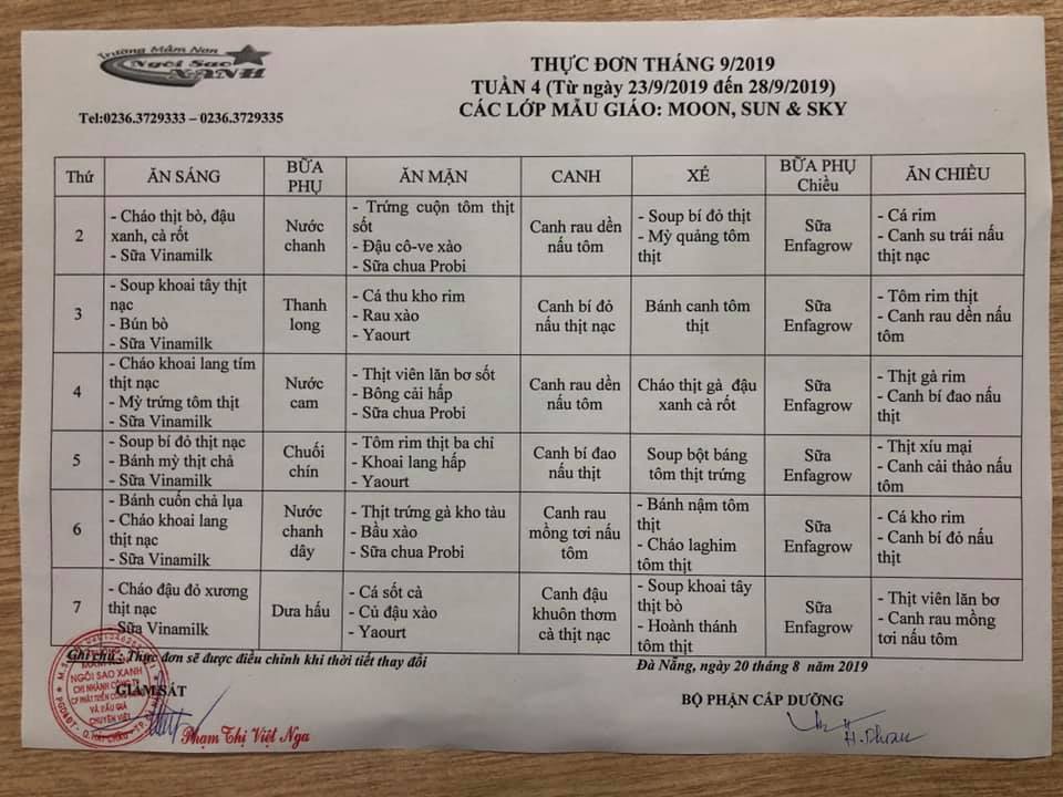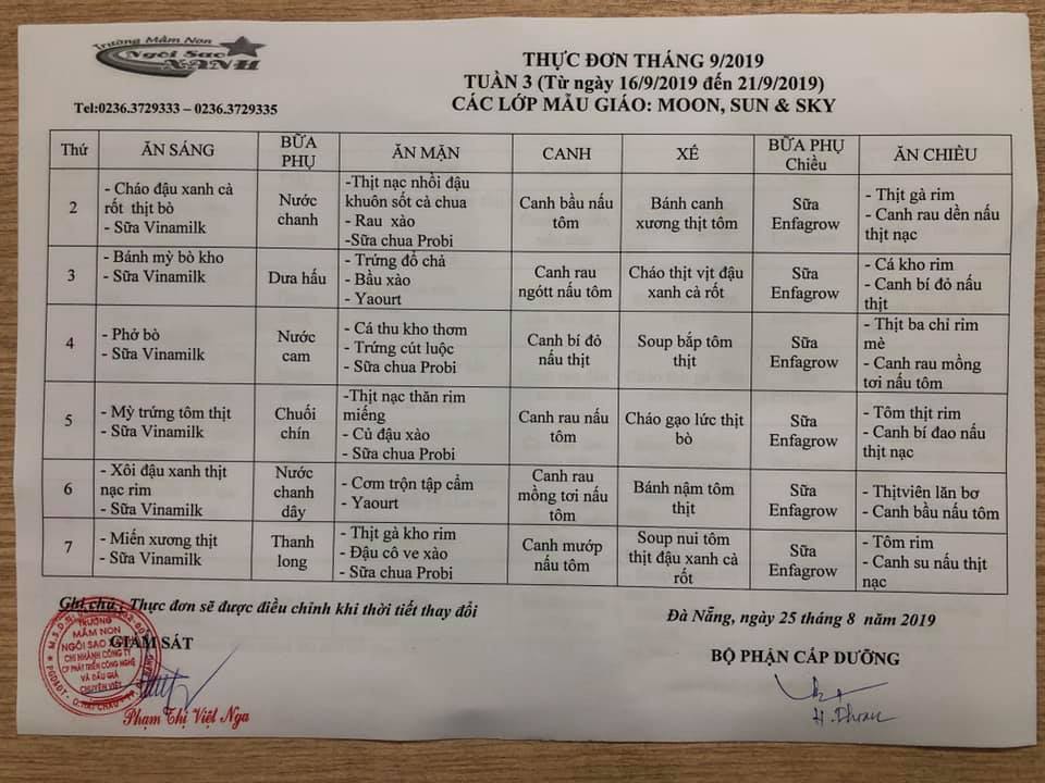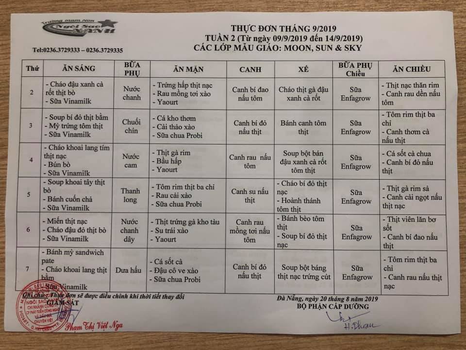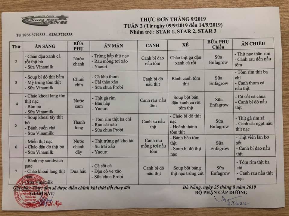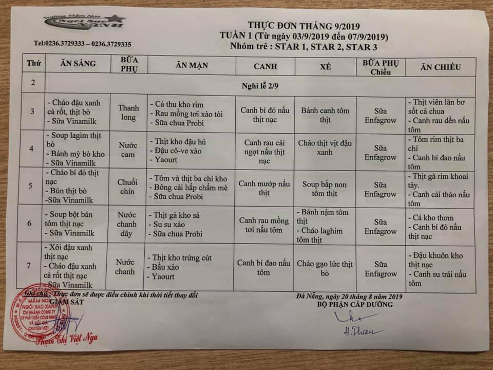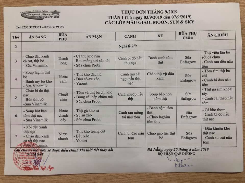 THỰC ĐƠN THÁNG 9 NĂM 2019 CỦA CÁC BÉ