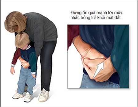cấp cứu viên đứng phía sau hoặc quỳ tựa gối vào lưng trẻ, vòng 2 tay ngang thắt lưng, đặt 1 nắm tay giữa bụng ngay dưới mấu kiếm xương ức, bàn tay còn lại đặt chồng lên. Kéo mạnh đột ngột hướng vào trong lên trên để tạo một sức ép lên bụng. Làm động tác này 5 lần nếu không đỡ thì mau chóng chuyển đến bệnh viện gần nhất.