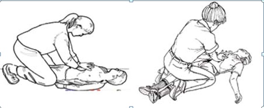 Đặt trẻ nằm nửa, cấp cứu viên quỳ gối, đặt 2 bàn tay chồng lên vùng xương ức đột ngột ấn mạnh, nhanh 5 lần hướng vào trong lên trên
