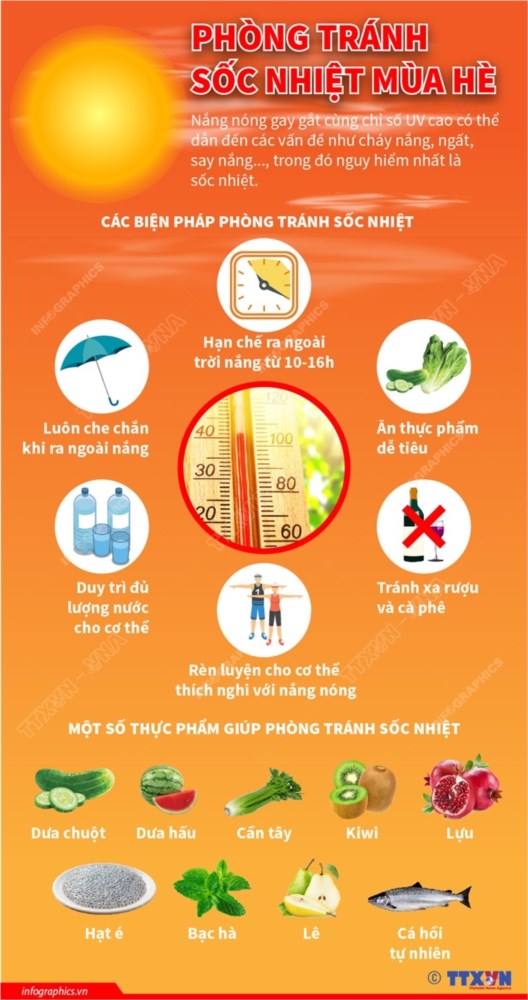 Sốc nhiệt là tình trạng nhiệt độ cơ thể tăng quá cao, dẫn đến làm tổn thương hệ thống thần kinh trung ương và các mô khác trên cơ thể, đặc biệt khi nhiệt độ cơ thể đạt ở ngưỡng 40 độ C hoặc cao hơn. Mặc quần áo rộng, nhẹ, sáng màu khi ra ngoài; uống đủ 2-3 lít nước một ngày; hạn chế chất lỏng chứa caffeine hoặc cồn... là cách chống sốc nhiệt.
