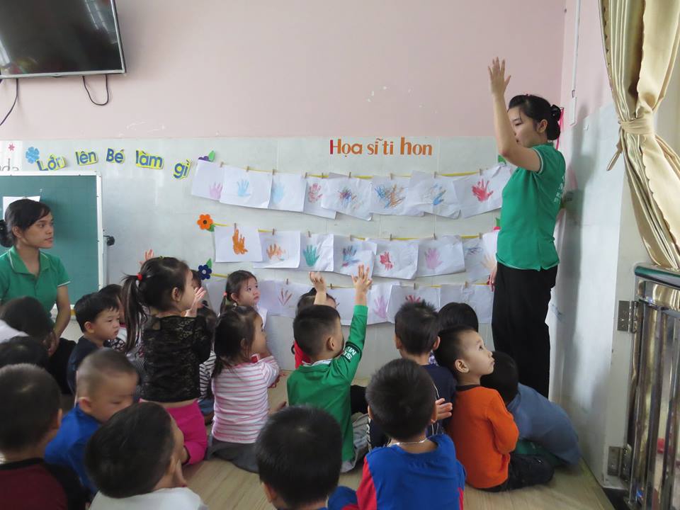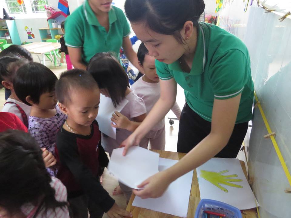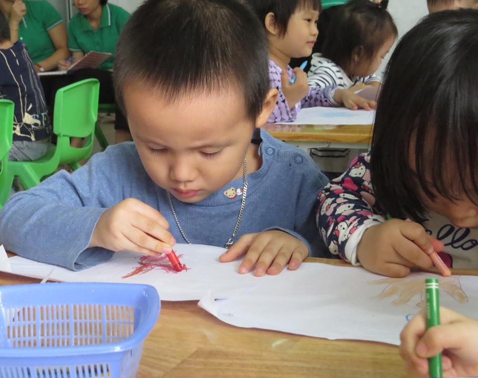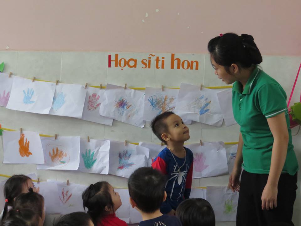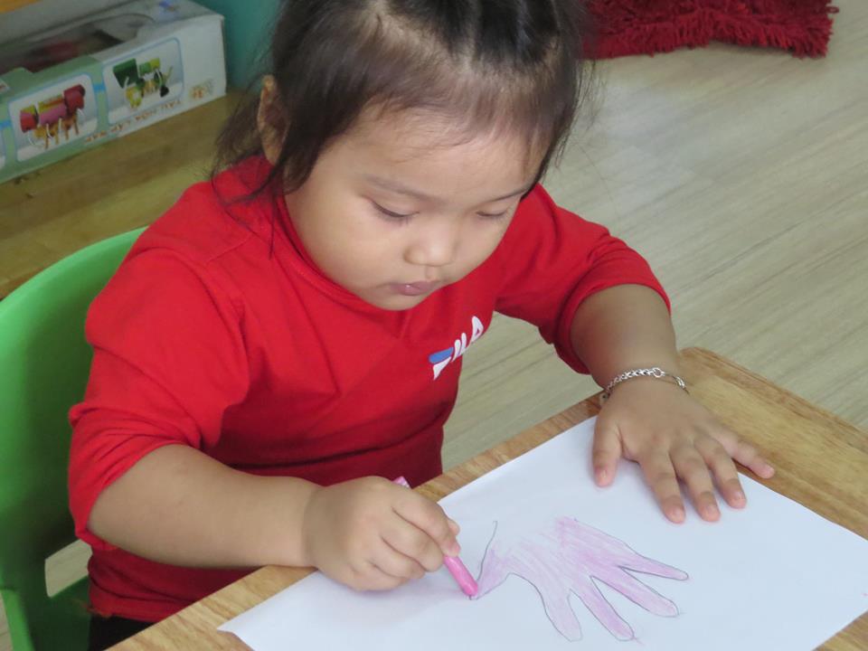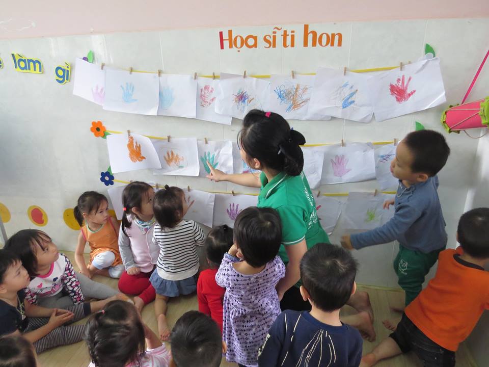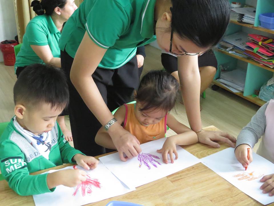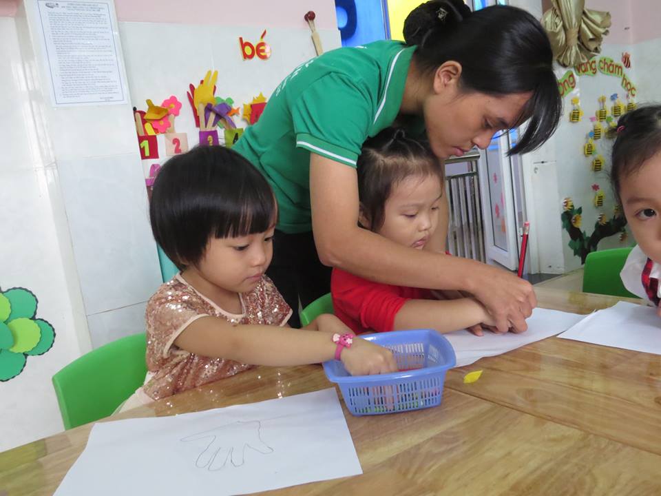 Giờ học "Lấy trẻ làm trung tâm": Cô giáo dạy các bé: vẽ và tô màu bàn tay của bé của lớp Mẫu giáo Bé 2