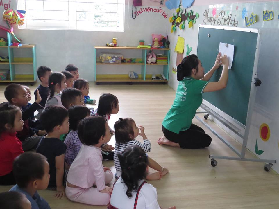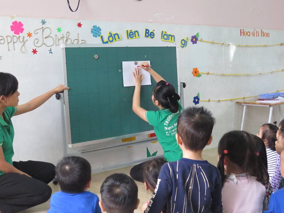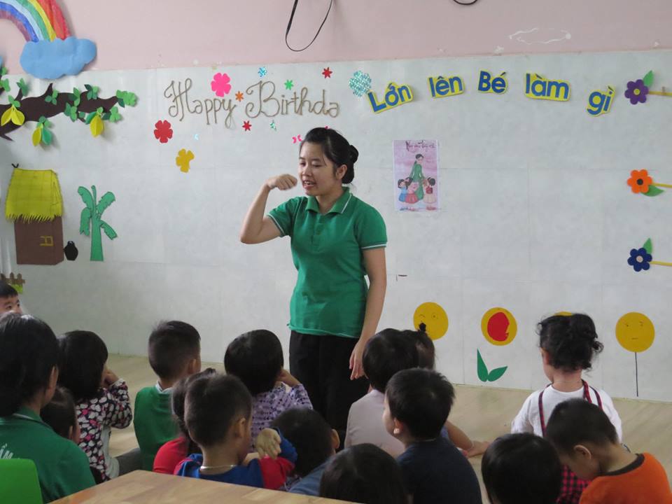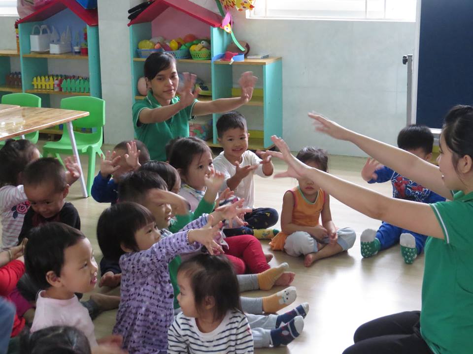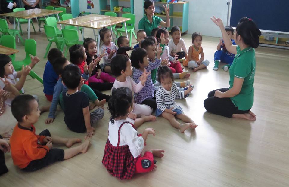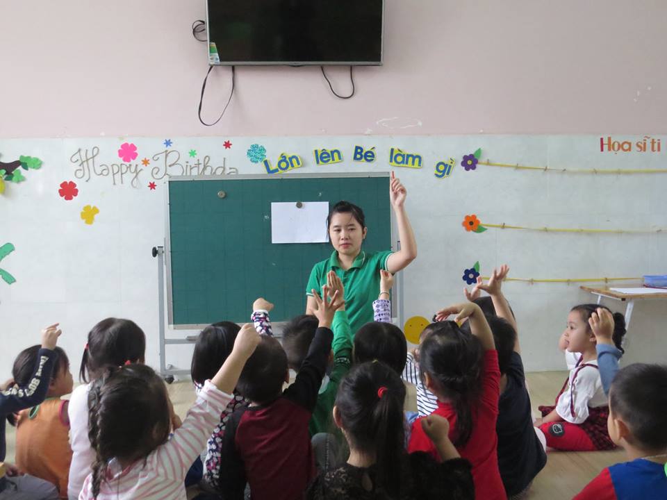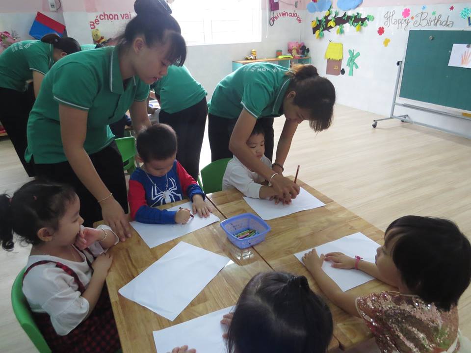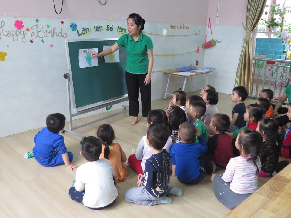 Giờ học "Lấy trẻ làm trung tâm": Cô giáo dạy các bé: vẽ và tô màu bàn tay của bé của lớp Mẫu giáo Bé 2