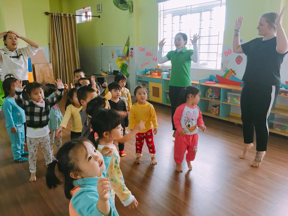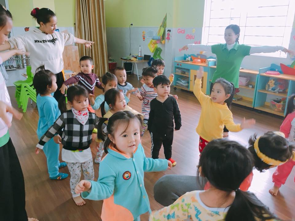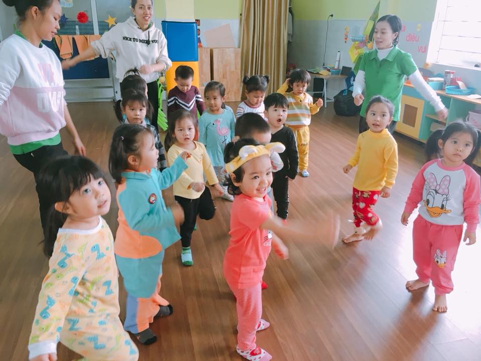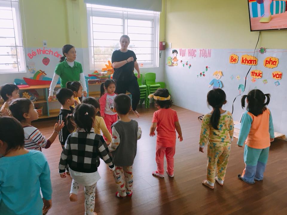 Cô Trine hướng dẫn các bé nhảy với các động tác kết hợp tay và chân theo điệu nhạc của chương trình ca nhạc dành cho thiếu nhi. Các con tham gia rất nhiệt tình và đầy hứng khởi. Trông các con học thật vui.