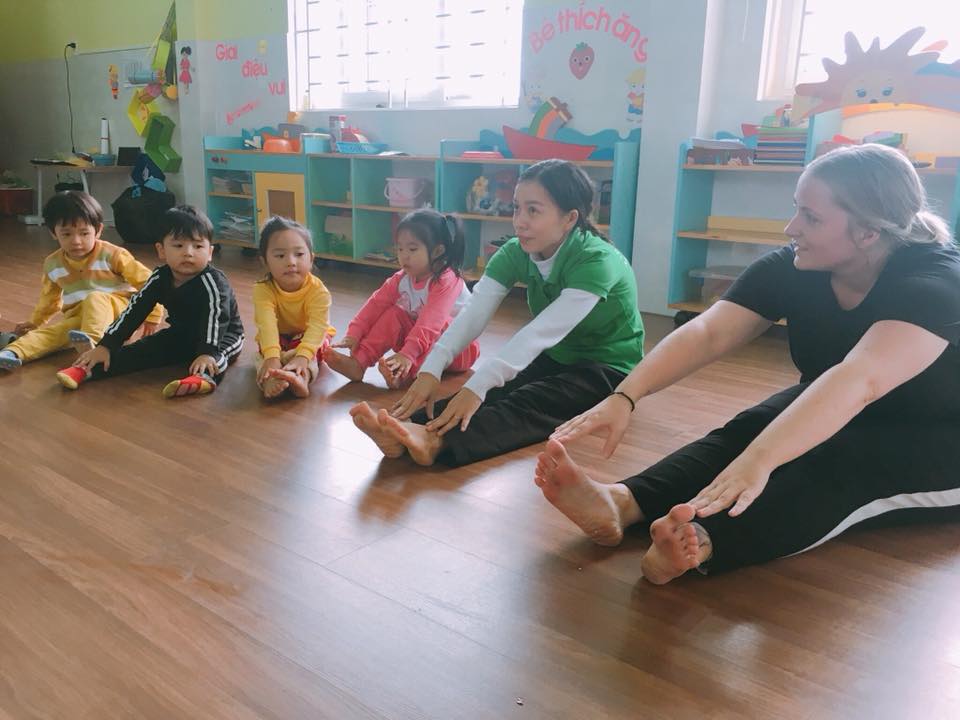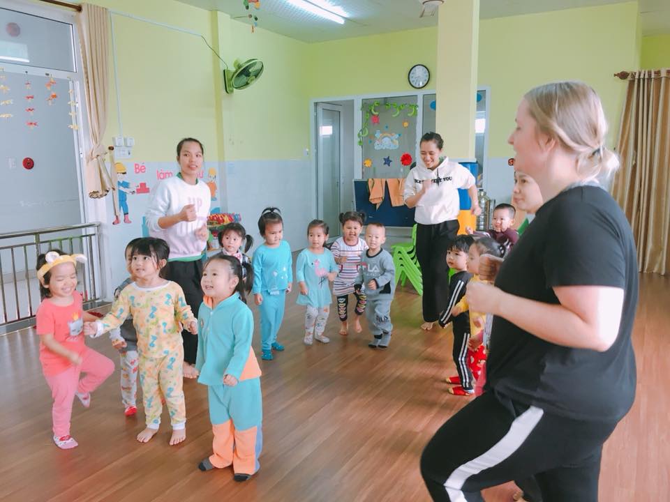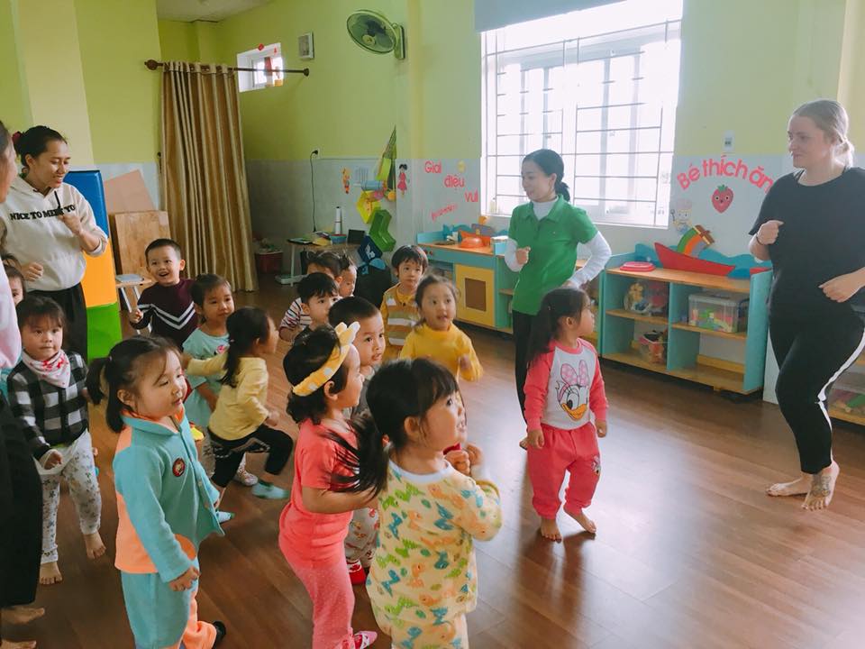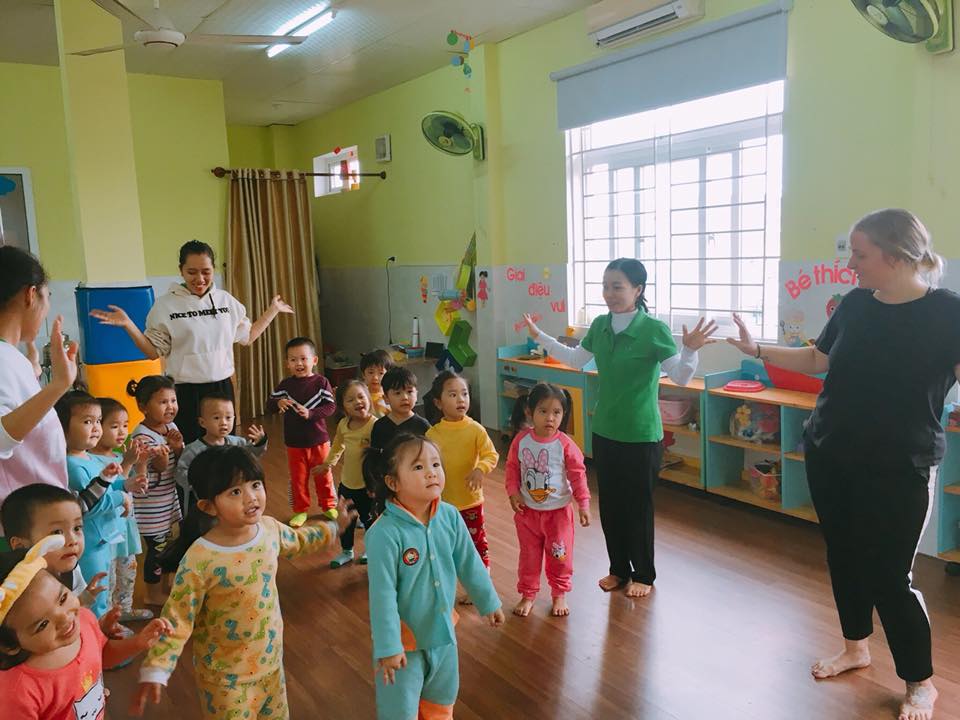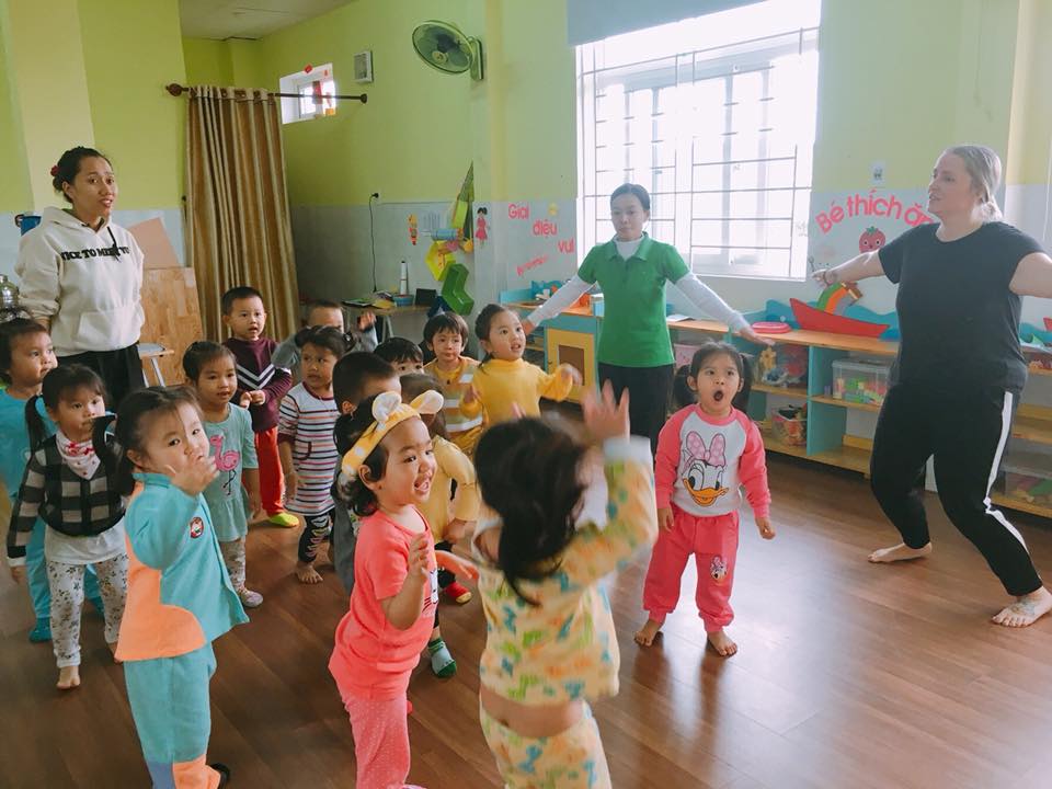 Cô Trine hướng dẫn các bé nhảy với các động tác kết hợp tay và chân theo điệu nhạc của chương trình ca nhạc dành cho thiếu nhi. Các con tham gia rất nhiệt tình và đầy hứng khởi. Trông các con học thật vui.