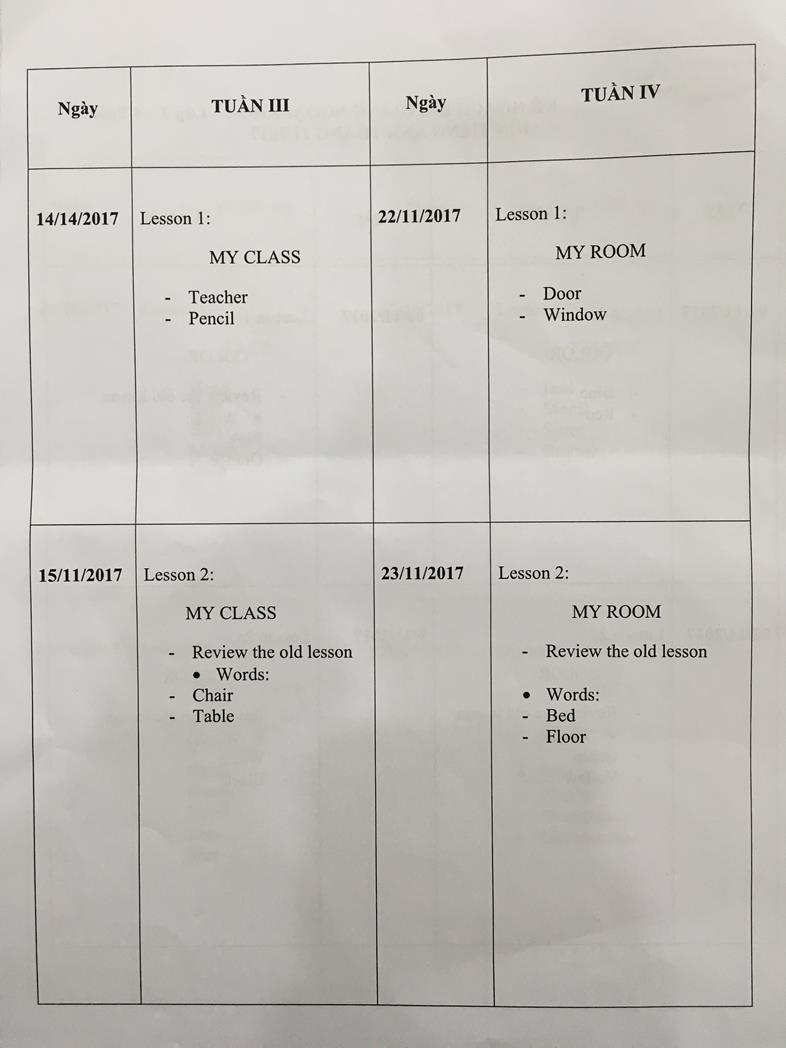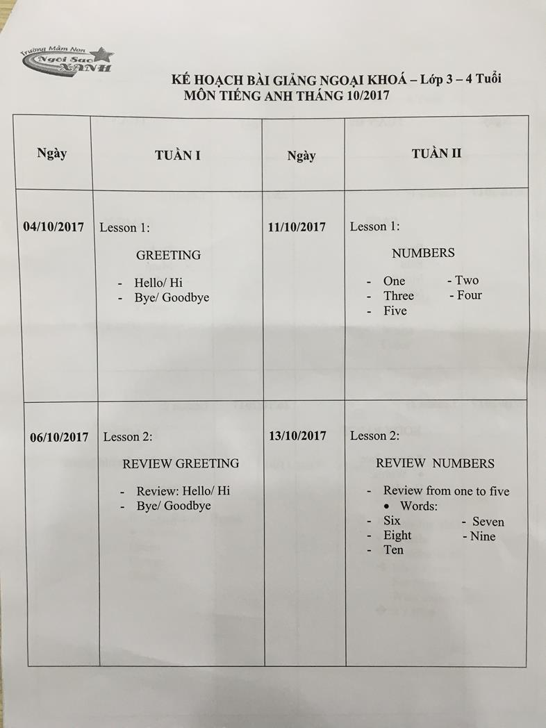 Giáo án lớp ngoại khóa Anh văn tháng 10/2017 và 11/2017 (Mẫu giáo Bé)