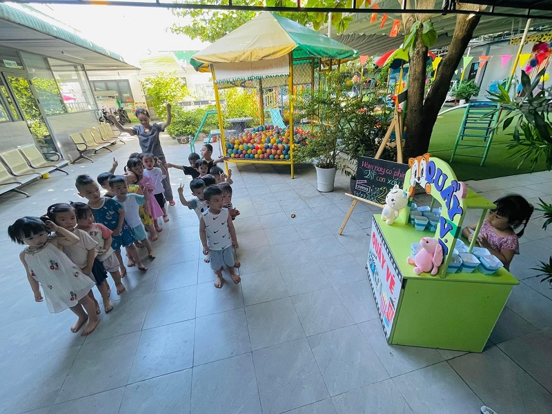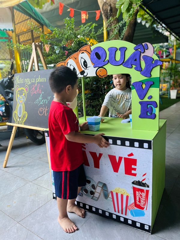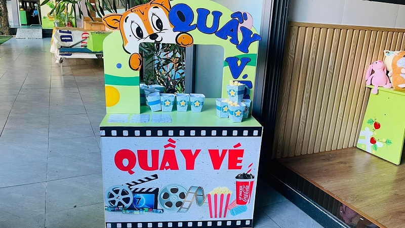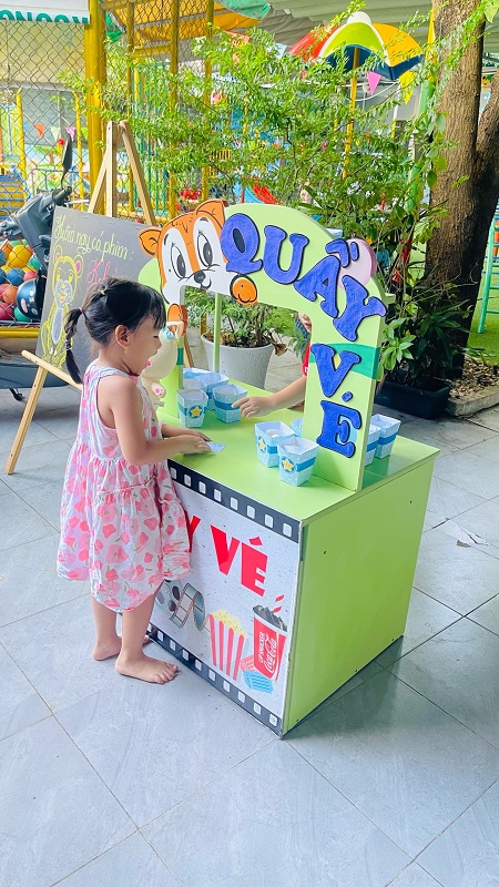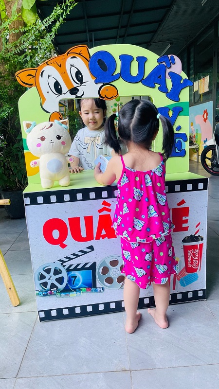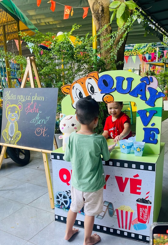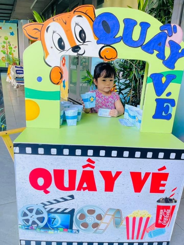 Các bạn nhỏ hào hứng xếp hàng mua vé xem phim, mua bỏng ngô soát vé và chờ đến giờ phim được chiếu thật là thú vị