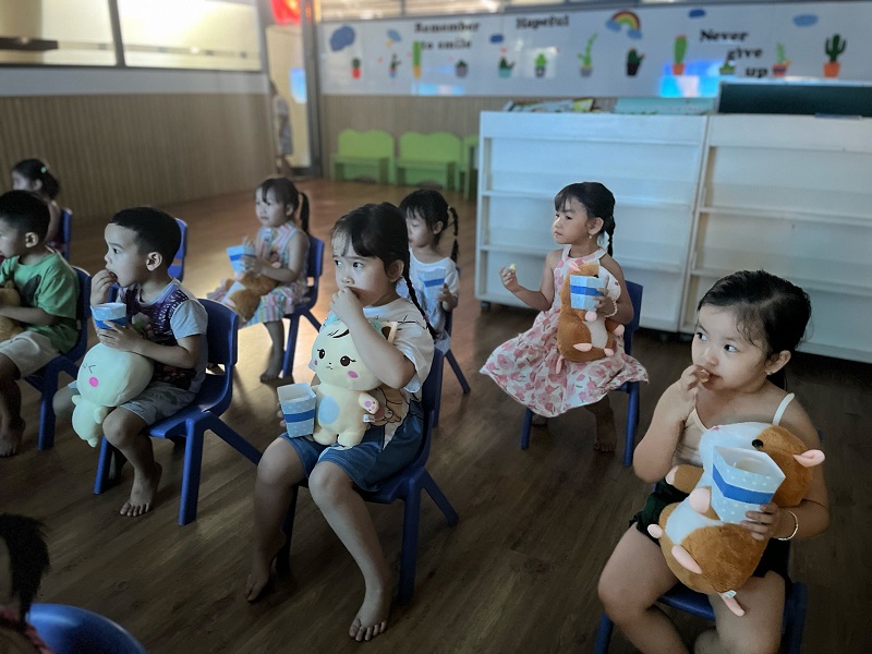 Trong lúc xem phim các con được nhâm nhi những hạt bỏng ngô thơm ngọt và được tận hưởng hình ảnh và âm thanh sống động nên bạn nào cũng thích thú.