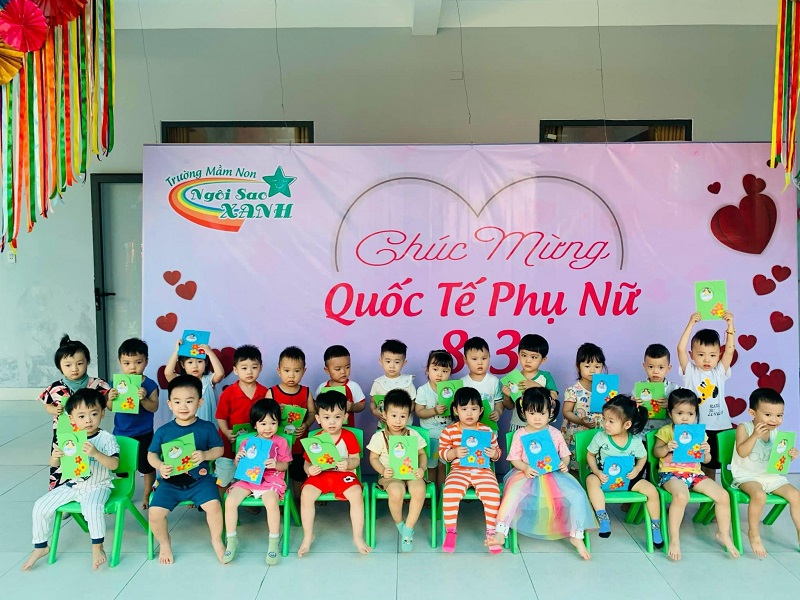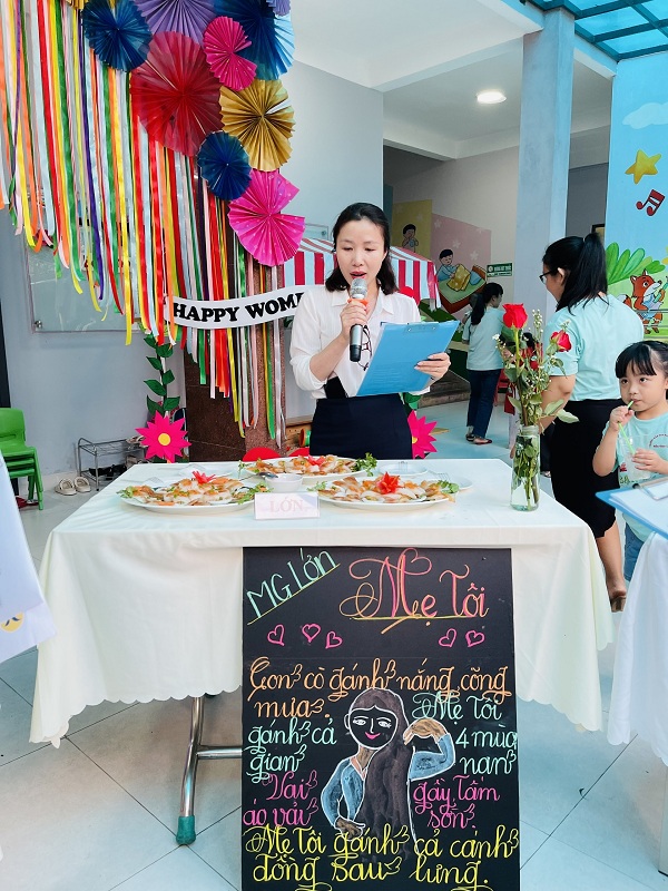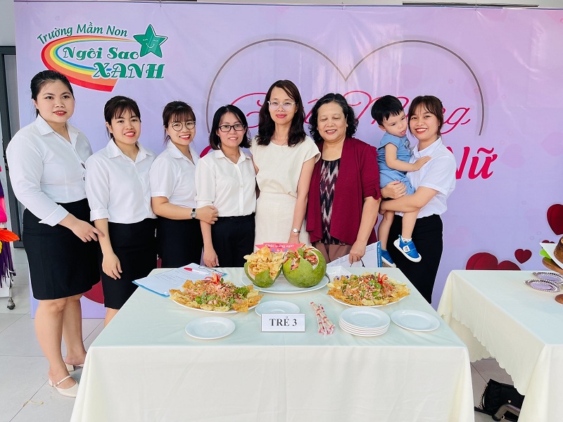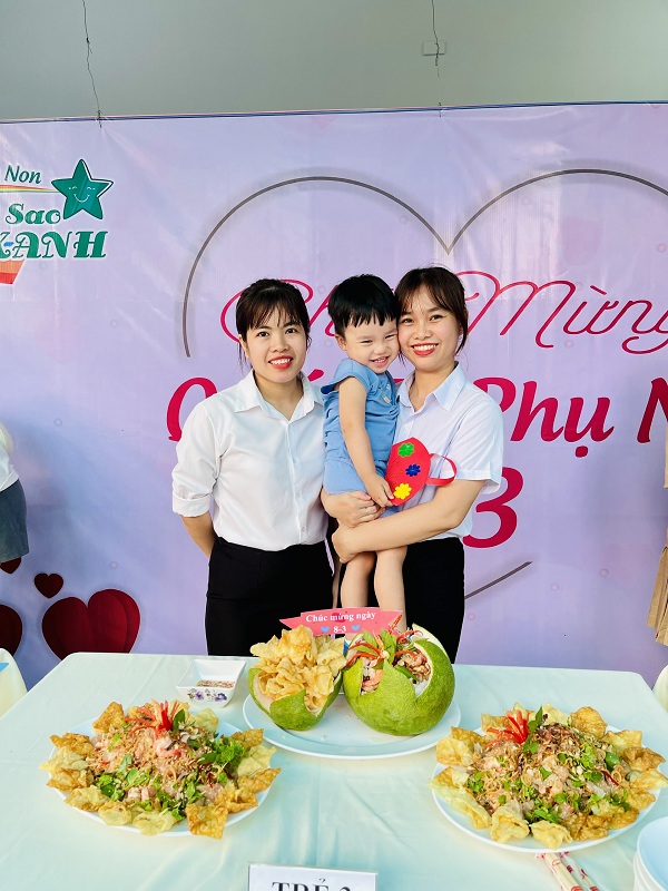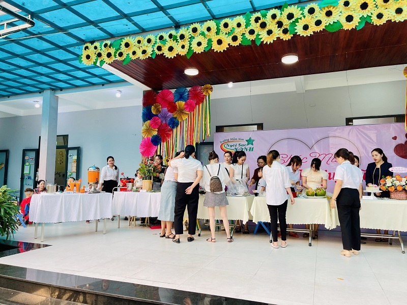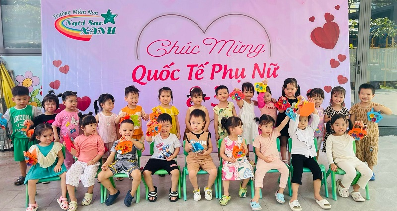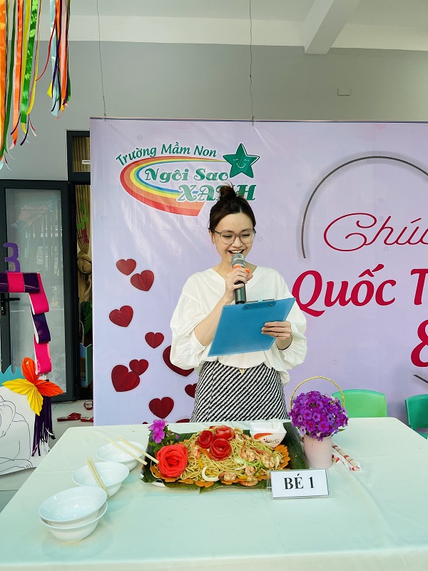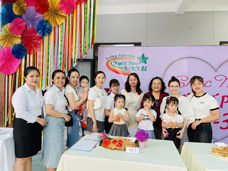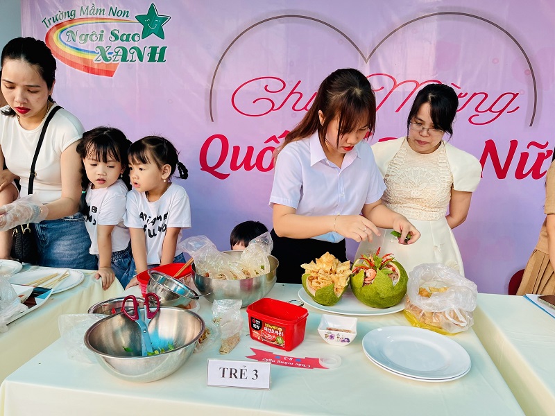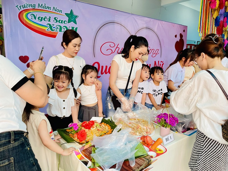 Kỷ niệm 114 năm ngày Quốc tế Phụ nữ (8/3/1910 - 8/3/2022), nhằm giúp trẻ có thêm hiểu biết về ngày quốc tế phụ nữ, trường mầm non Ngôi Sao Xanh đã tổ chức các hoạt động sôi nổi chào mừng ngày 8/3 với sự tham gia hưởng ứng tích cực của phụ huynh và học sinh. Ở hoạt động giao lưu gặp mặt giữa nhà trường với phụ huynh, phụ huynh- học sinh và giáo viên: các bé cùng với mẹ được hóa thân thành những đầu bếp chuyên nghiệp làm các món ăn bổ dưỡng như: mì trộn hải sản, gỏi bưởi tôm thịt, bánh táo, bánh đông sương, bánh bèo- bánh lọc. Với sự sáng tạo và đôi tay khéo léo, các bé với mẹ đã tạo ra những lẵng hoa thật đẹp mắt để tặng cho các bà, các mẹ và các cô giáo. Xuyên suốt chủ đề trẻ còn được trải nghiệm các hoạt động làm quà, làm thiệp tặng bà tặng mẹ cùng cô và các bạn. Kết thúc hoạt động là chương trình giao lưu văn nghệ với những bài thơ, lời ca tiếng hát sâu lắng, vui tươi đong đầy tình cảm của các con học sinh thân yêu dành tặng cho các bà, các mẹ và các cô giáo của mình thay cho lời cảm ơn vì công sinh thành, chăm sóc, dạy dỗ các con hàng ngày. Với việc tổ chức cho trẻ được tham gia các hoạt động trải nghiệm trường MN Ngôi Sao Xanh nhận được sự quan tâm, hưởng ứng nhiệt tình của các bậc phụ huynh, sự chia sẻ đồng hành của ban lãnh đạo nhà trường. Qua đó, gắn kết sự phối hợp giữa phụ huynh và nhà trường trong công tác chăm sóc giáo dục trẻ đồng thời giáo dục cho trẻ kỹ năng sống, giáo dục tình yêu thương, chia sẻ và đoàn kết. Nhân ngày quốc tế phụ nữ 8/3, kính chúc các bà, các mẹ, các GV –NV nhà trường luôn mạnh khỏe, xinh đẹp và hạnh phúc. Dưới đây là một số hình ảnh của hoạt động.